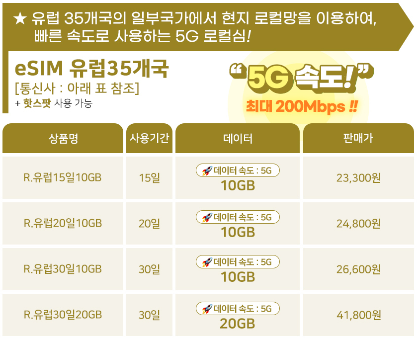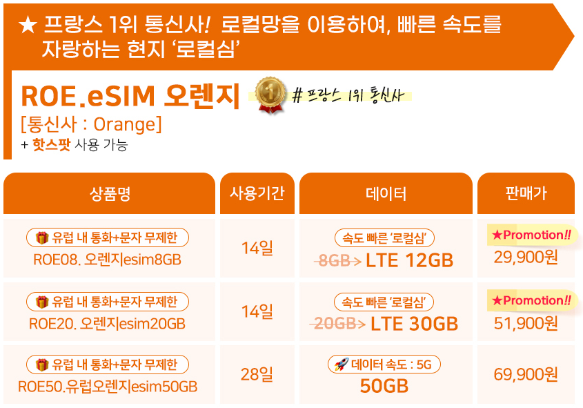 이심은 유럽 내 통화가 필요했고, 틈틈이 테더링도 해야 했기 때문에 프랑스 통신사인 오렌지의 28일 50GB 를 선택했다. 와이프는 꼭 필요한 것이 아니라서 유럽 35개국(홍콩통신사)의 10GB 상품을 선택했다. 사실 한국에서도 잘 안터지는 5G는 큰 기대가 없지만, 전체적인 일정에서 다른 통신사로 해야 서로 보완이 가능하지 않을까 싶어 각기 다른 통신사를 선택했다.