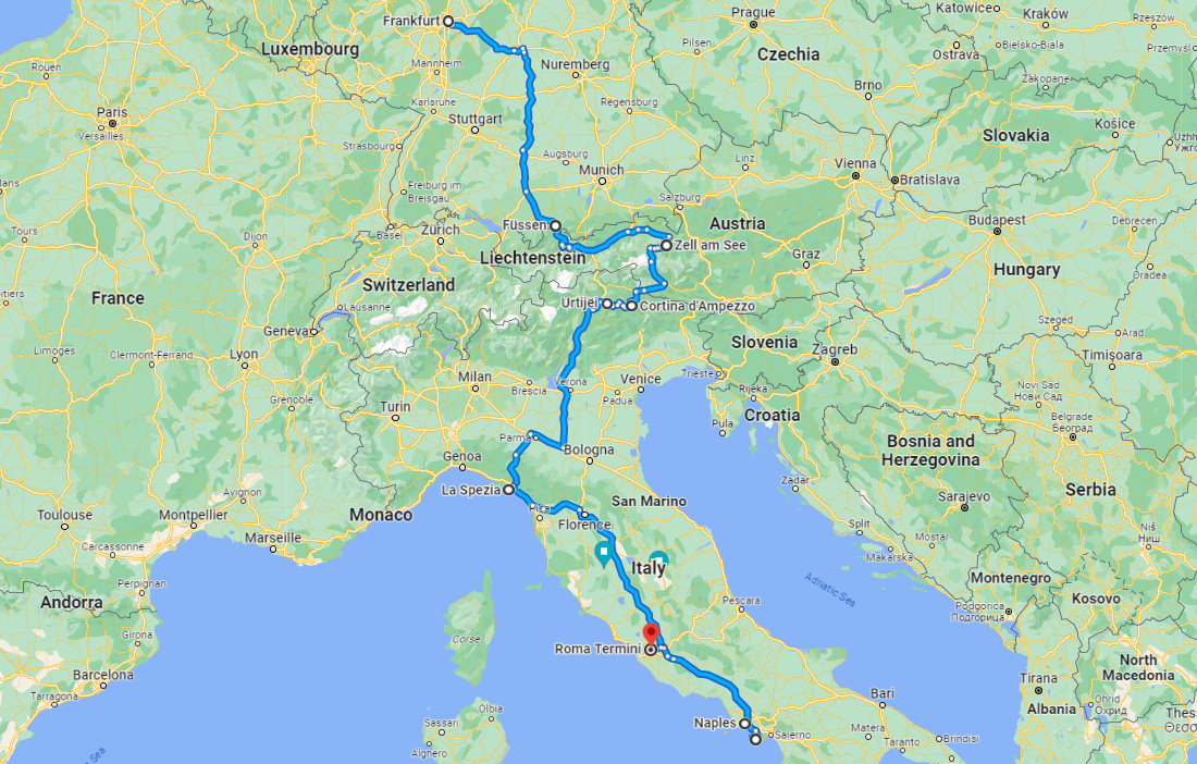 프랑크푸르트(Frankfurt) -> 퓌센(Fussen) -> 첼암제/카프룬(Zel am See/Kaprun) -> 그로스글로크너(Grossglockner) -> 코르티나담페초(Cortina d'Ampezzo) -> 오르티세이(Ortisei) -> 베로나(Verona) -> 친퀘테레(Cinque Terre) -> 토스카나(Toscana) -> 움브리아(Umbria) -> 나폴리(Naples) -> 아말피/포지타노(Amalfi/Positano) -> 소렌토(Sorrento) -> 로마(Roma)