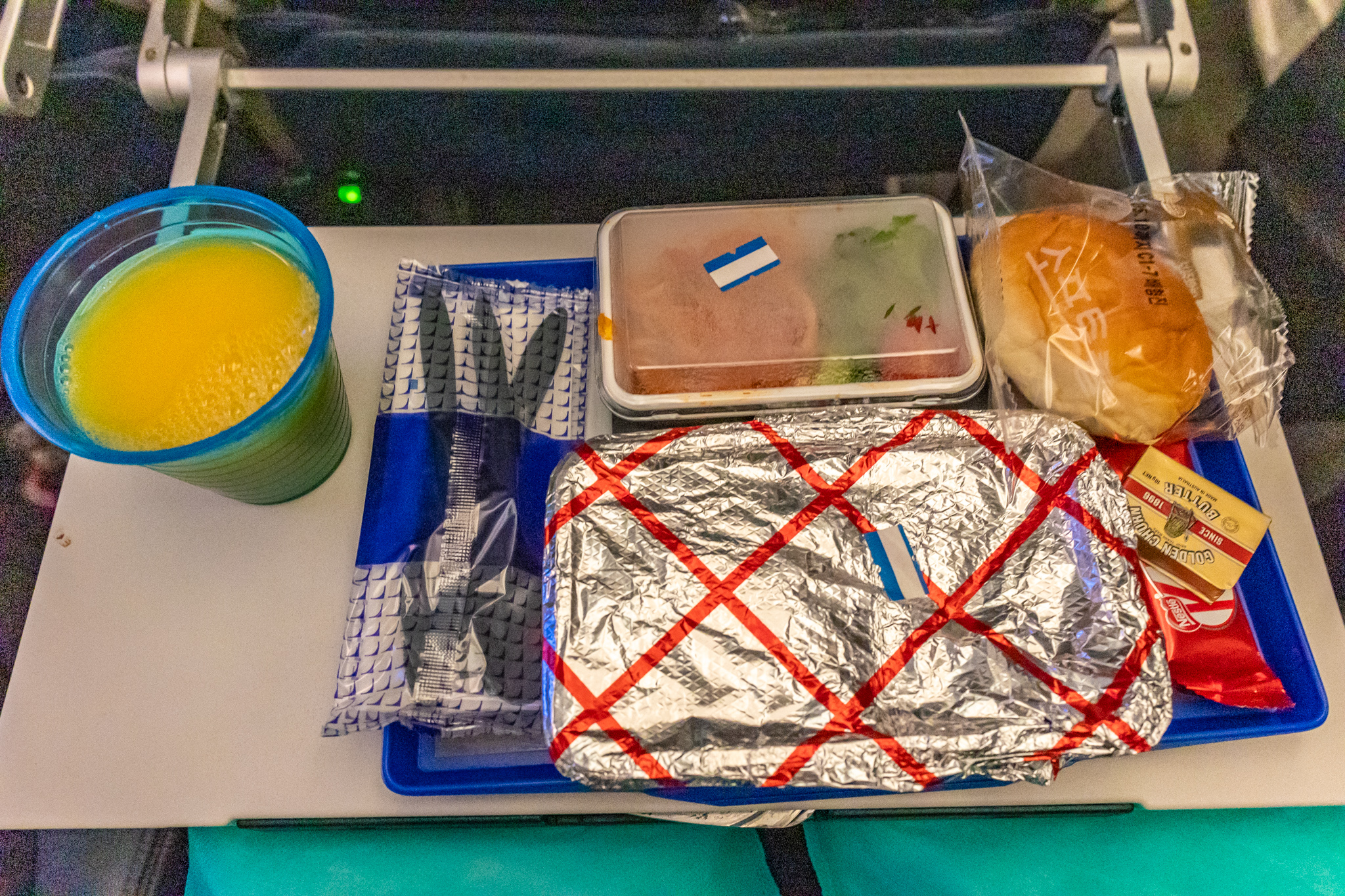 비행기가 출발하고 첫번째 식사. 곤약면 느낌의 매콤한 누들과 하이라이스 느낌이 나는 소고기 요리였다. 모닝롤과 킷캣 그리고 버터가 추가로 제공되었다. 라운지에서 밥을 먹고 온 지 얼마 되지 않아서 많이 배고프지는 않았지만, 그래도 하나정도는 뚝딱 비워낼 수 있었다. 킷캣과 모닝롤은 혹시 몰라서 중간 간식으로 챙겨두고.