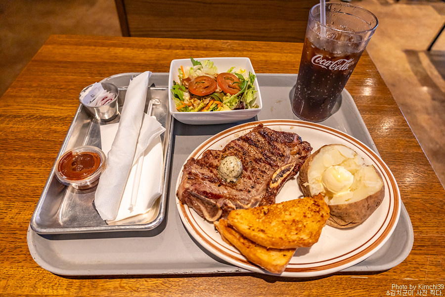 주문을 하고, 진동벨을 받아서 기다리다가.. 스테이크를 받아오는 형태였다. 감자는 찐감자에 버터를 올렸고, 화이트 브레드를 골랐다. 샐러드에는 발사믹 소스. 솔직히 스테이크는 먹을만은 했지만, 다소 질긴편이었다. 요즘 미국의 스테이크하우스에서 제대로 스테이크를 먹으려면 더 비싸기 때문에, 가성비는 맞다. 그렇지만, 내가 집에서 직접 구워먹는 스테이크가 더 맛있는 수준이다.