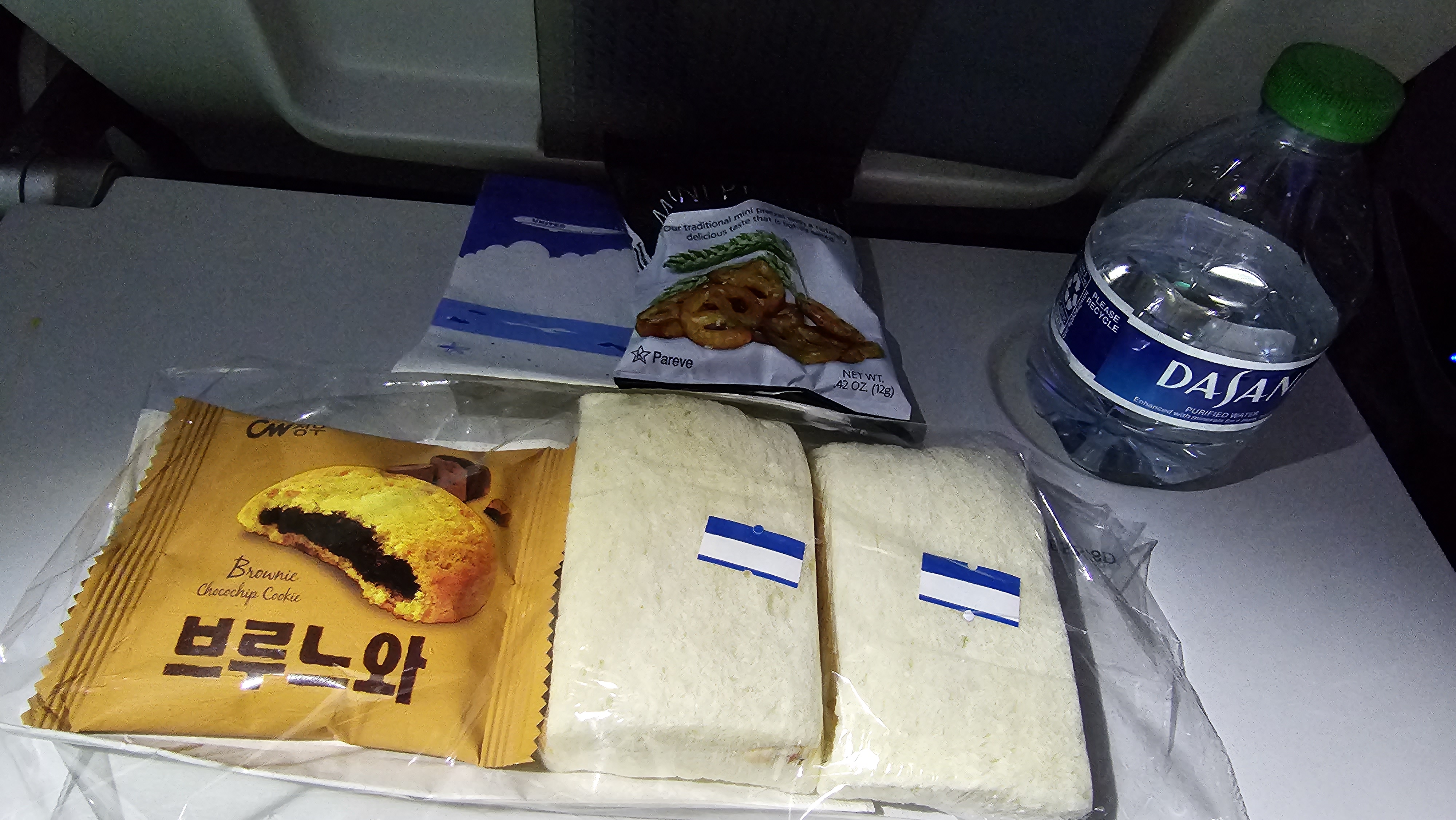 비행 중간에 나눠준 간식. 브라우니와 샌드위치2개, 그리고 프레젤이었다. 나름 작은 물 한병도 주는 센스.