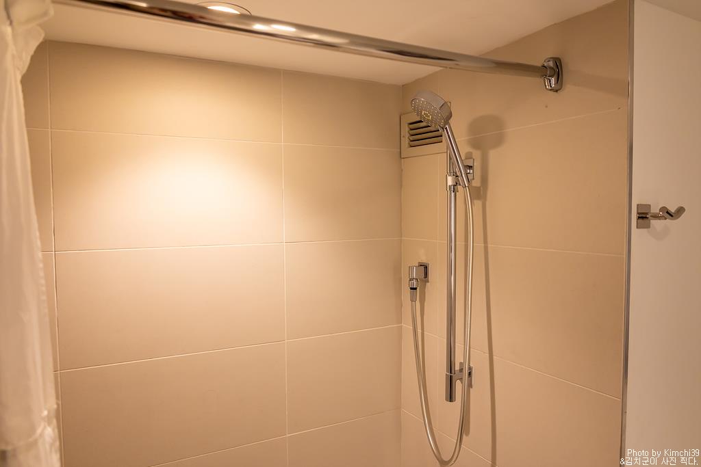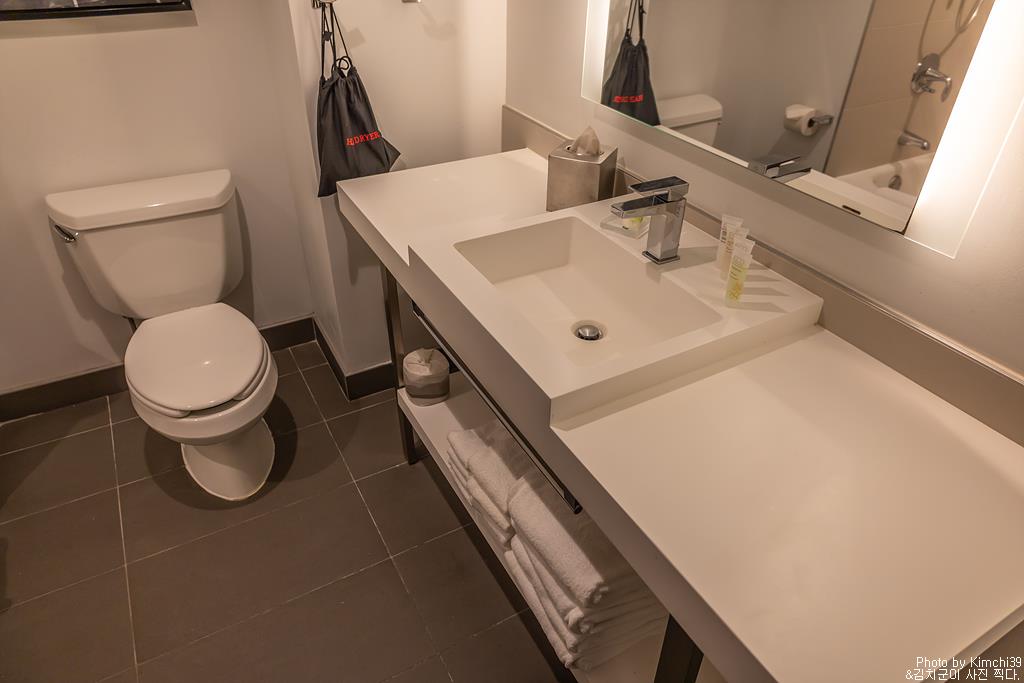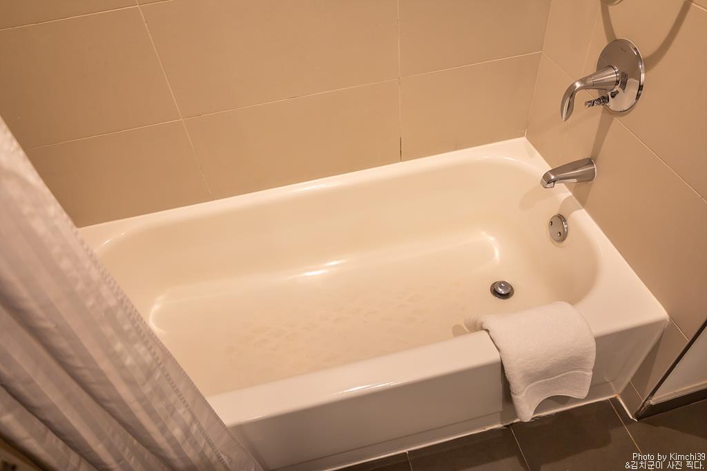 욕실은 무난한 편. 미국호텔 답지않게 샤워기가 고정식이 아니라 핸드헬드 방식이었다. 고정식이면 아이들을 씻기기에 너무 불편한데, 이렇게 들 수 있는 샤워기면 그 불편함이 훨씬 덜하다. 첫째는 혼자서 샤워를 하지만, 둘째는 아직 씻겨줘야 하는 만큼 아직은 고정식이 불편하다.