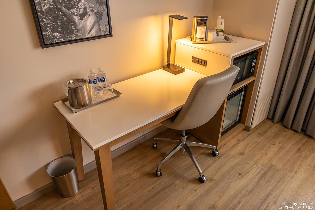 보지는 않았지만, 큰 테레비젼도 있었고.. 비즈니스 호텔답게 테스크도 준비되어 있었다. 무료로 물도 2병이 제공되었고, 전자렌지와 냉장고도 있어서 좋았다. 아침이 포함되어 있지 않았지만, 한국에서 캠핑용으로 햇반과 즉석국을 가져왔기 때문에 아침식사는 전자렌지를 이용해서 간단히 할 수 있었다.