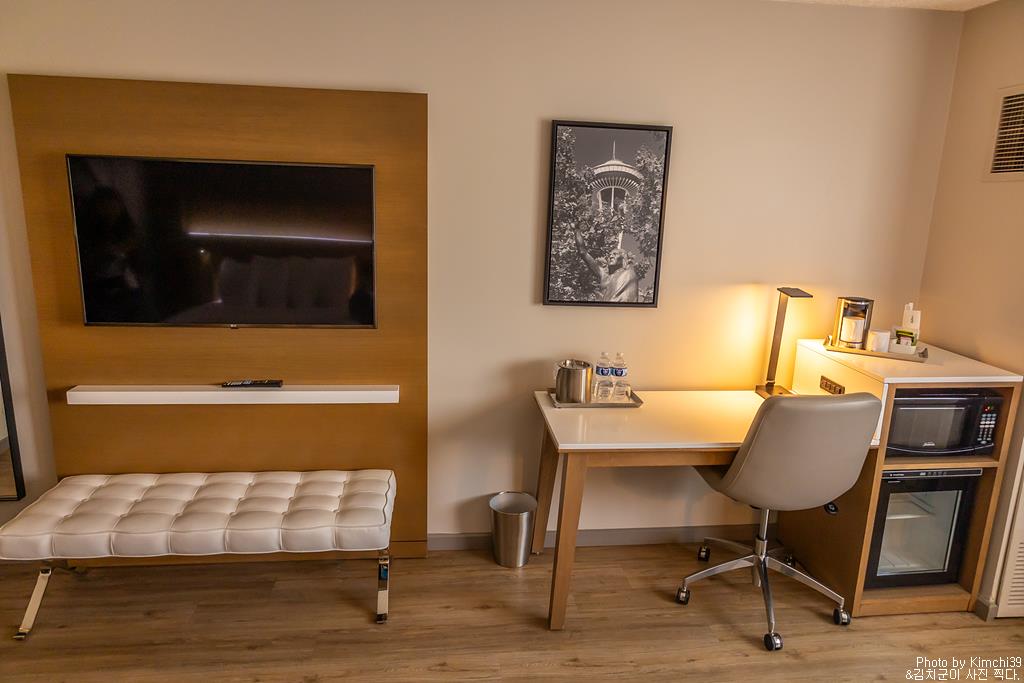 우리가 도착한 시간은 오후1시쯤이었기 때문에, 바로 체크인이 안되면 짐을 맡겨놓고 시애틀 시내로 나갈 예정이었다. 그런데 체크인 중에 잠깐 기다려보라고 하더니, 10~20분 정도 후면 객실이 가능할거라고 해서 기다렸다가 객실에 짐을 놓고 나가는 것으로 결정을 했다. 로비에는 쉴 수 있는 푹신한 공간도 있었으니까. 그런데, 5분도 안지나 객실이 가능하다고 해서 바로 객실도 이동했다.