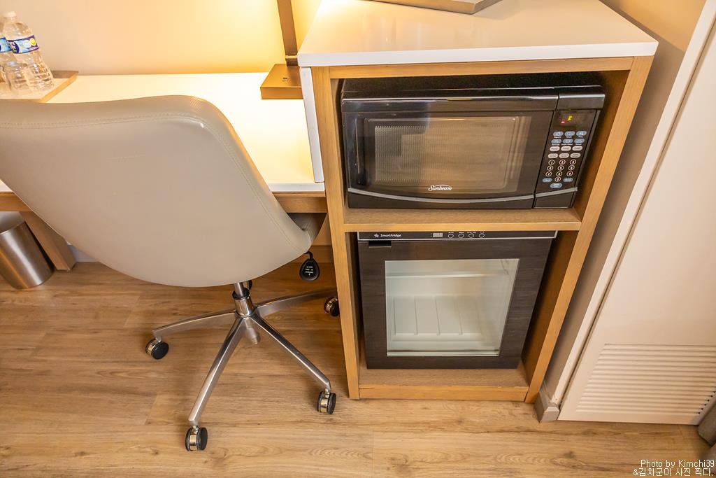 커피메이커와 커피2개, 그리고 머그컵이 있었고.. 그 아래로 전자렌지와 냉장고가 있었다. 미국은 고급호텔로 갈수록 전자렌지를 보기 어려운데, 래디슨 호텔은 애매한 레벨인지 전자렌지가 있었다. 사실 로드트립 중에는 전자렌지의 유무 때문에 오히려 비싼 호텔에 안묵게 되는 경우도 꽤 많으니까 있으면 무조건 좋다.