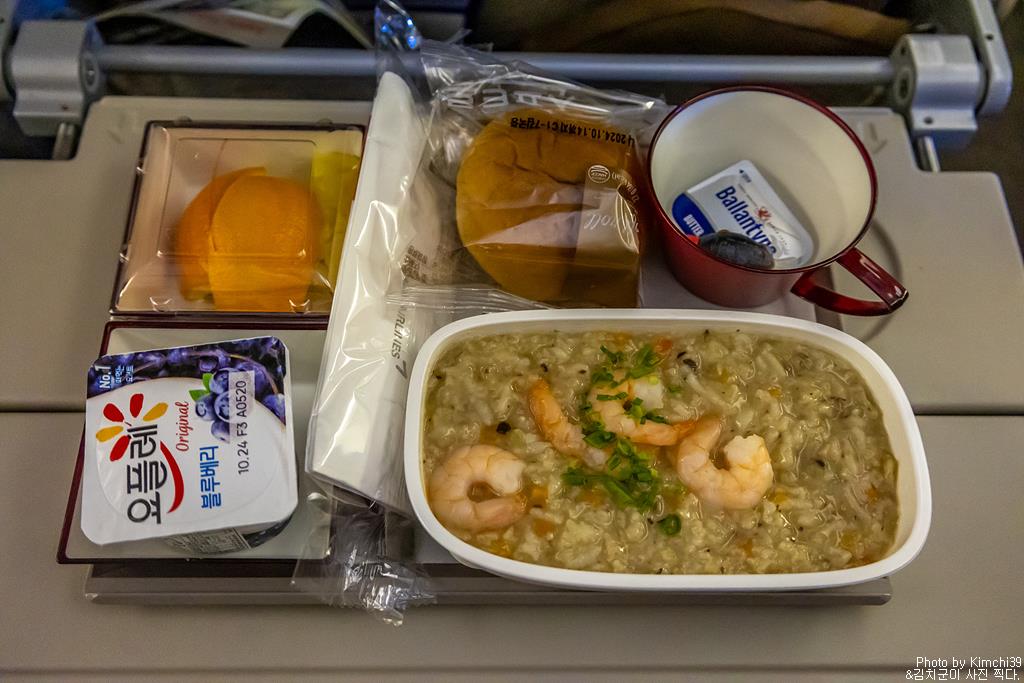 그렇게 졸다깨다를 반복하다보니 두번째 기내식이 나왔다. 오믈렛 또는 죽. 그래서 죽을 골랐는데, 새우가 나름 실하게 들어있었다. 아침식사라서 간단한 메뉴였겠지만, 역시 죽은 먹으면 금새 배가 고픈 메뉴다. 그렇지만, 오믈렛보다는 죽이 좋은 나는 한국사람. 죽은 다소 싱거운 편이지만, 간장이 함께 제공된다.