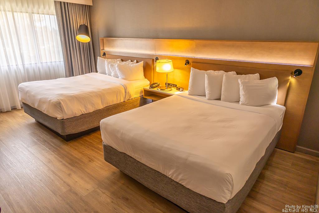 퀸침대 2개가 있는 객실은 아이2명을 동반한 가족여행에 적합했다. 이제는 아이들이 초등학생이 되다보니, 더블사이즈 침대에서 둘이 자기에는 뭔가 좁게 느껴져서 가능하면 퀸사이즈 침대 2개가 있는 객실을 선호하게 된다. 유럽이나 다른 나라라면 어려운 일이지만, 캐나다나 미국은 도심이 아닌 이상 퀸침대 2개가 상당히 흔하니까.
