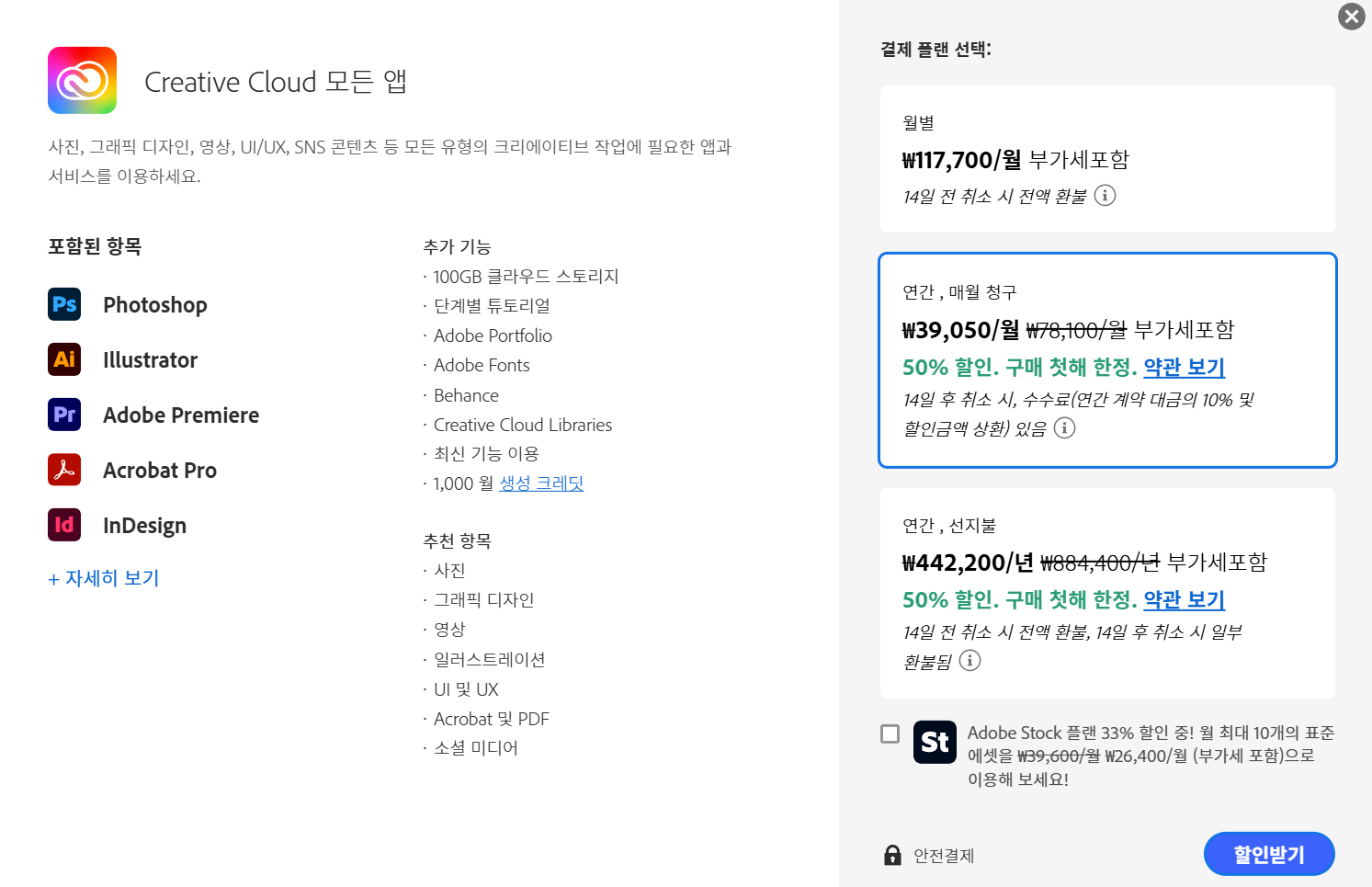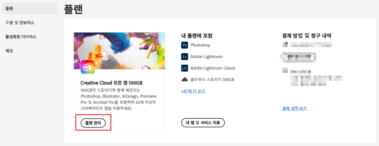 참고로 프로모션 가격은 1년간 유효하며, 그 이후에는 정상요금(70,100원/월)이 청구된다. 다만 어도비는 1년에 2-3번 정도 할인 프로모션을 하므로, 1년 후에 구독 취소 후 다시 다음 행사를 노려보는 방법도 있다.