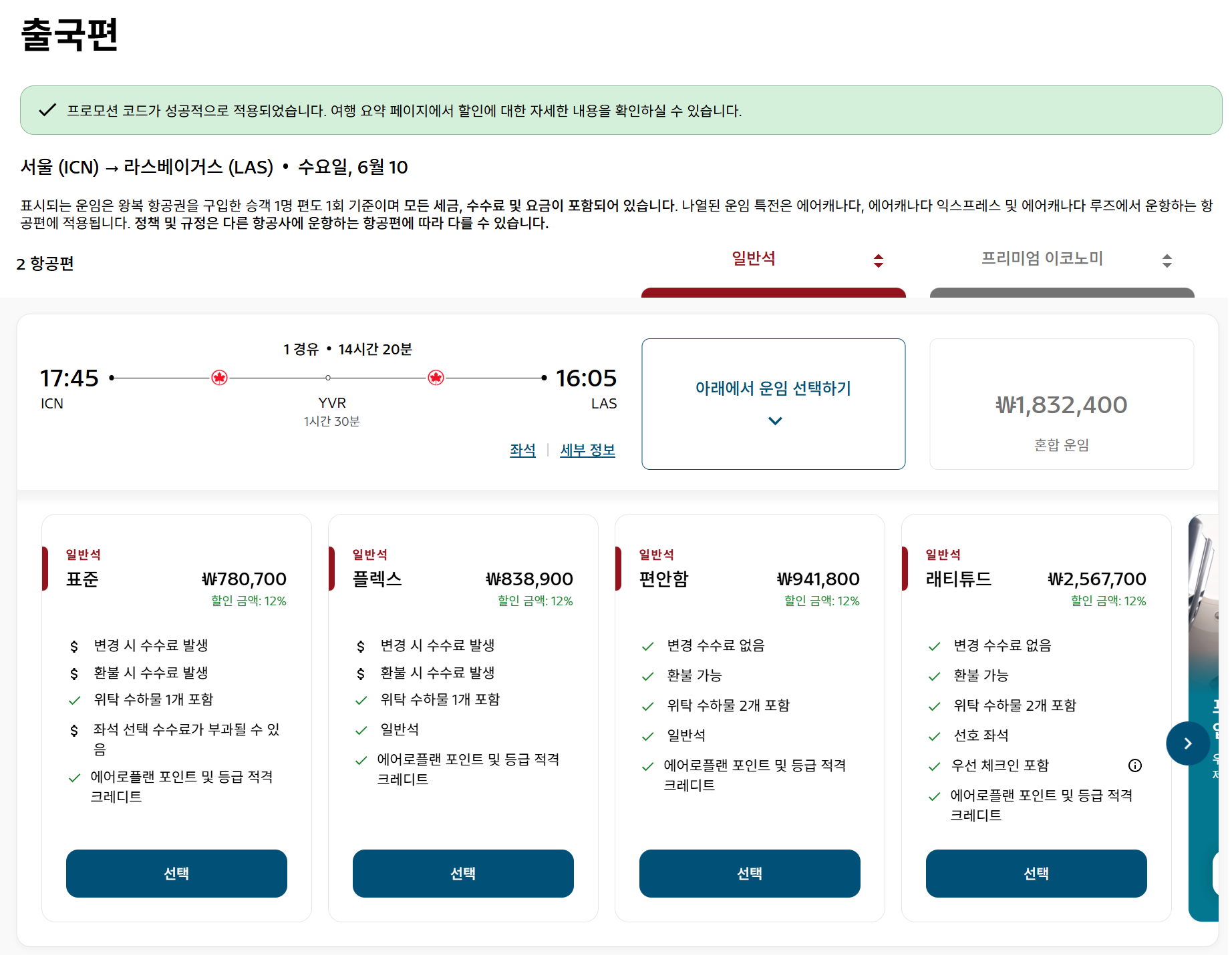 12% 할인이 적용된 금액. 서울 -> 라스베가스 구간이 780,700원으로 훨씬 더 저렴해 졌다. 이번 12% 할인 쿠폰의 경우, 1년에 1-2번밖에 나오지 않는 할인쿠폰인데다가, 내년 여름 여행 시즌인 8월까지로 여행기간이 넉넉하기 때문에 미국 및 캐나다 여행이 확정되었다면 이번 기회를 놓치지 않는 것이 좋다. 검색결과 상단에는 '프로모션 코드가 성공적으로 적용되었습니다.' 라는 멘트가 있어서 적용여부를 확실하게 볼 수 있다.