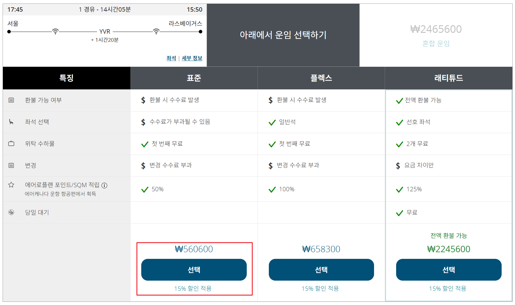 최종적으로는 위와같이 왕복 전체에 할인이 적용되어, 기존보다 훨씬 금액이 저렴해진 것을 알 수 있다. 가격비교 사이트에서 나오는 금액은 할인코드 적용 전 금액이기 때문에, 이 경우에는 무조건 에어캐나다 공식 홈페이지에서 할인쿠폰을 적용 후 예약하는 것이 더 저렴할 가능성이 높다.