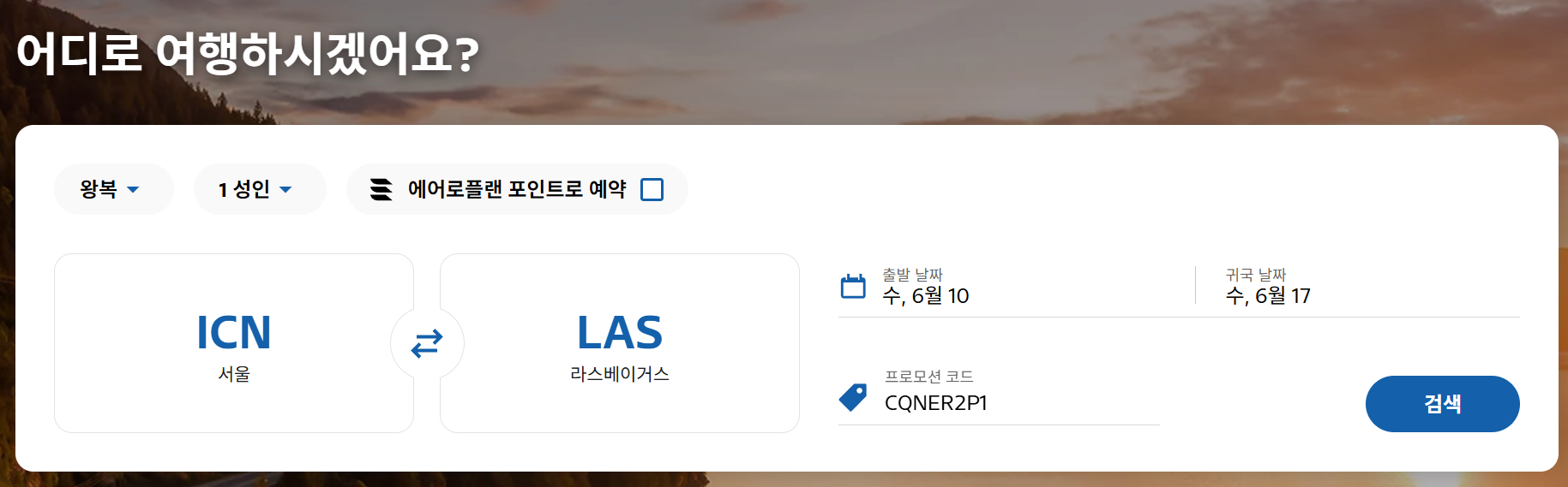예시에서는 내년 6월, 인천 <-> 라스베가스 행 왕복 항공권을 조회해 보았다. 12% 할인코드인 TQ7FB4E1 을 적용했다. 할인코드는 12% 할인이 적용되지만, 세금과 수수료에는 적용이 되지 않기 때문에, 비싼항공권일 수록 할인율이 커지게 된다. 아무래도 저렴한 항공권일수록 총 항공권 가격에서 세금과 수수료가 차지하는 비중이 높기 때문이다.