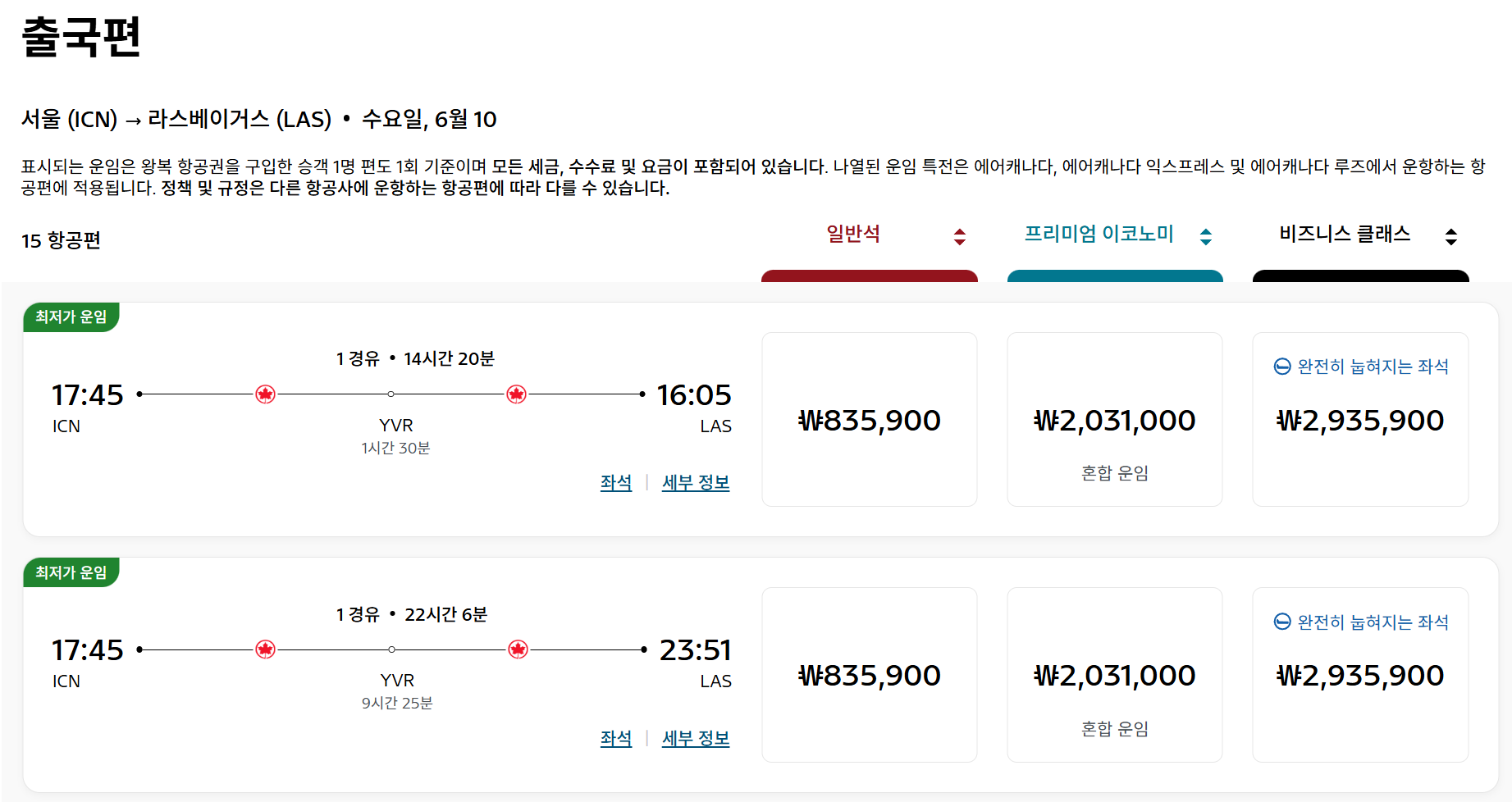 할인이 적용되기 전 금액. 서울 -> 라스베가스 구간의 편도 금액이 835,900원으로 표기된다.