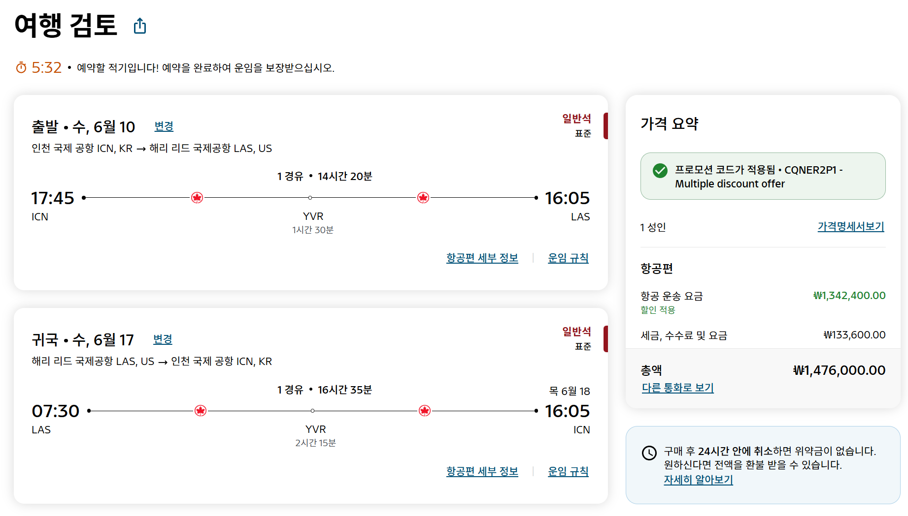 최종적으로는 위와같이 왕복 전체에 할인이 적용되어, 기존보다 훨씬 금액이 저렴해진 것을 알 수 있다. 가격비교 사이트에서 나오는 금액은 할인코드 적용 전 금액이기 때문에, 이 경우에는 무조건 에어캐나다 공식 홈페이지에서 할인쿠폰을 적용 후 예약하는 것이 더 저렴할 가능성이 높다.
