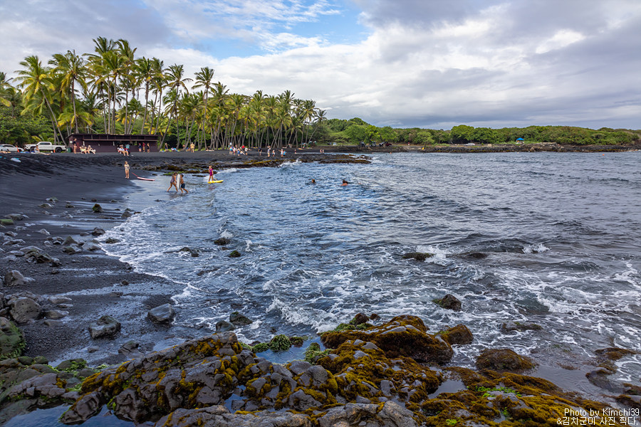 다음목적지는 푸날루우 블랙샌드비치파크(Punaluu Black Sand Beach Park). 검은 모래 해변과 거북이들이 많이 출몰하는 것으로 유명한 해변이다.