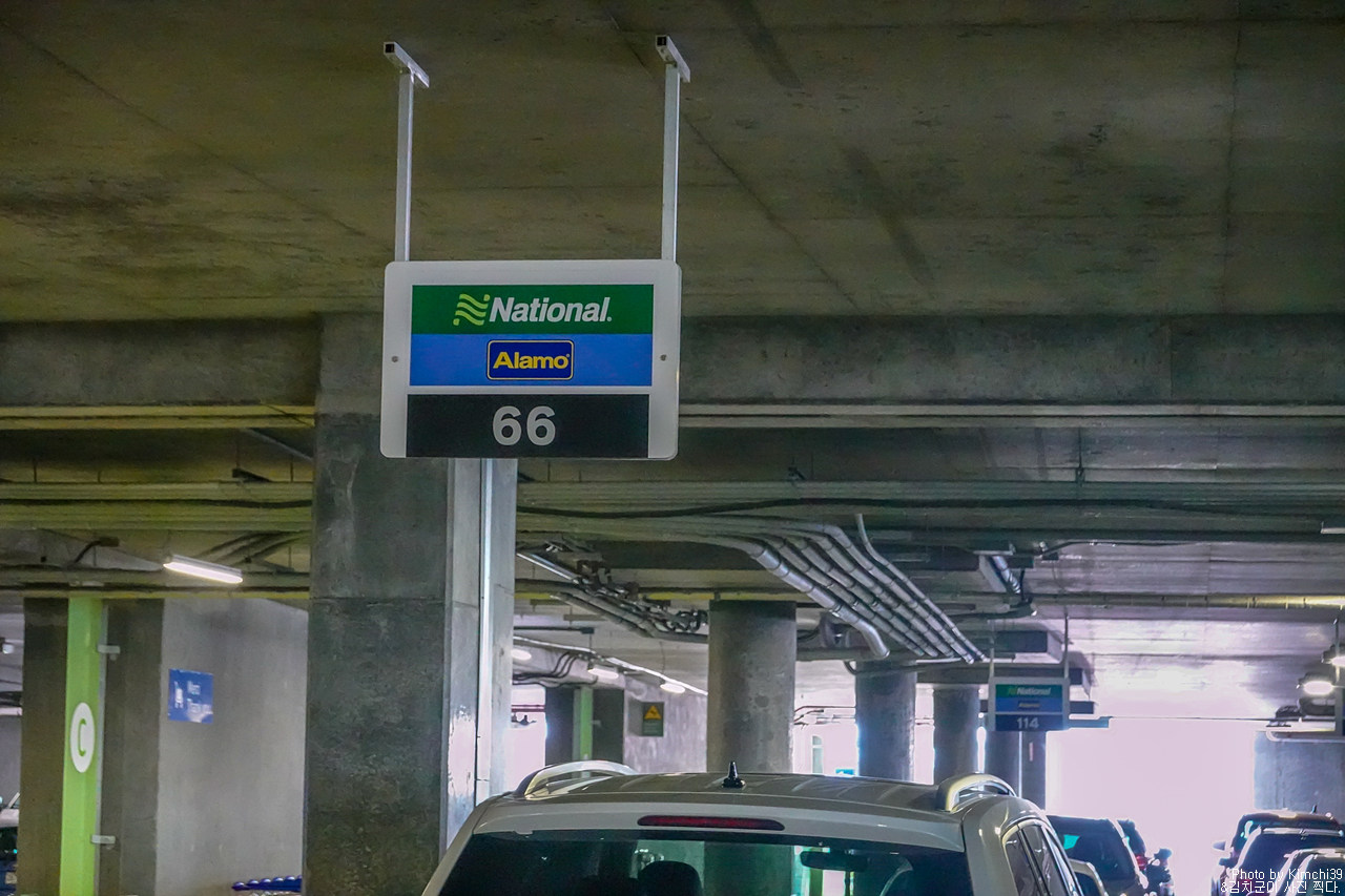 허츠 렌터카 픽업 존. 직접 고르는 방식이 아니기 때문에 차량 사이즈별 구분은 되어있지 않고, 차량 위와 바닥에 번호가 쓰여있어 그 번호로 차량을 찾으면 된다. 차량 번호는 키와 함께 받은 패킷에 나와있다.