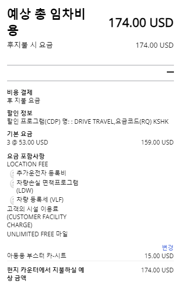 최종 렌트 요금을 보면, 요금 총액에 아동용 카시트의 금액이 포함되어있는 것을 알 수 있다. 예약할 때에는 이렇게 포함된 것으로 나오지만, KHSK 할인코드를 이용해서 예약했을 경우 현장에서 이 카시트 비용이 제외된다. 그러므로 최종적으로는 $164 가 렌트 비용이라고 보면 된다. 다만, 지점에서 실수로 카시트 비용을 청구하는 사례도 종종 있기 때문에, 인수시에 영수증을 확인하여 꼭 제대로 금액이 빠져있는지 확인하는 것이 중요하다.