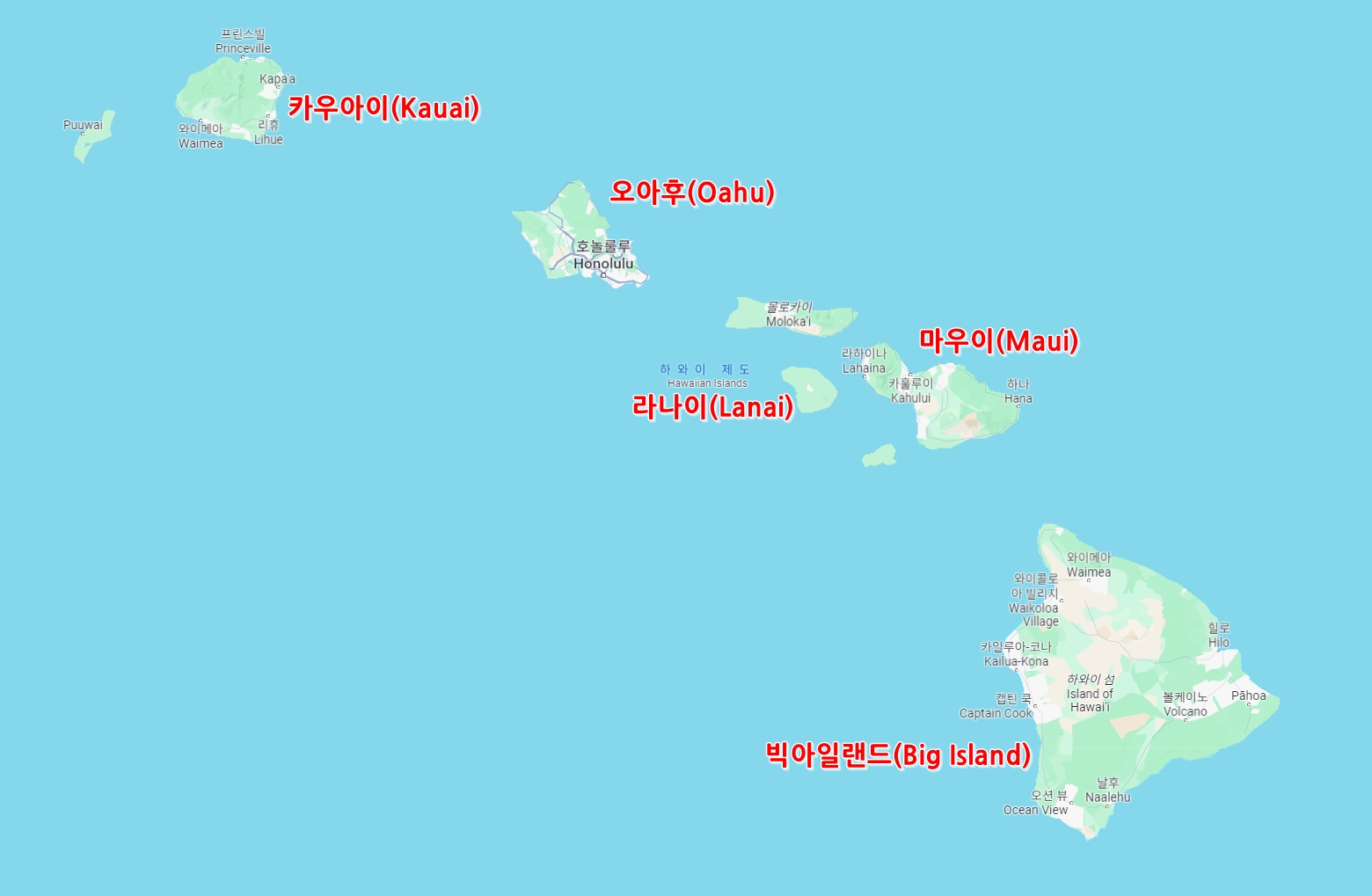 하와이에 대해 처음 공부할 때, 고민이 되는 것이 바로 어느 섬을 가야 하는지다. 처음에는 하와이를 가야겠다는 생각에 공부를 시작하지만, 대부분의 인천 출발 국제선이 오아후섬의 호놀룰루 국제공항에 도착하고, 그 외의 이웃섬인 마우이, 빅아일랜드, 카우아이는 주내선(국내선)을 이용해서 이동해야 한다는 것을 깨닫게 된다. 욕심같아서야 4개의 섬을 다 다녀보고 싶겠지만, 길지 않은 한국사람들의 일정을 고려하면 1개나 2개 섬을 가는 패턴이 가장 많다.