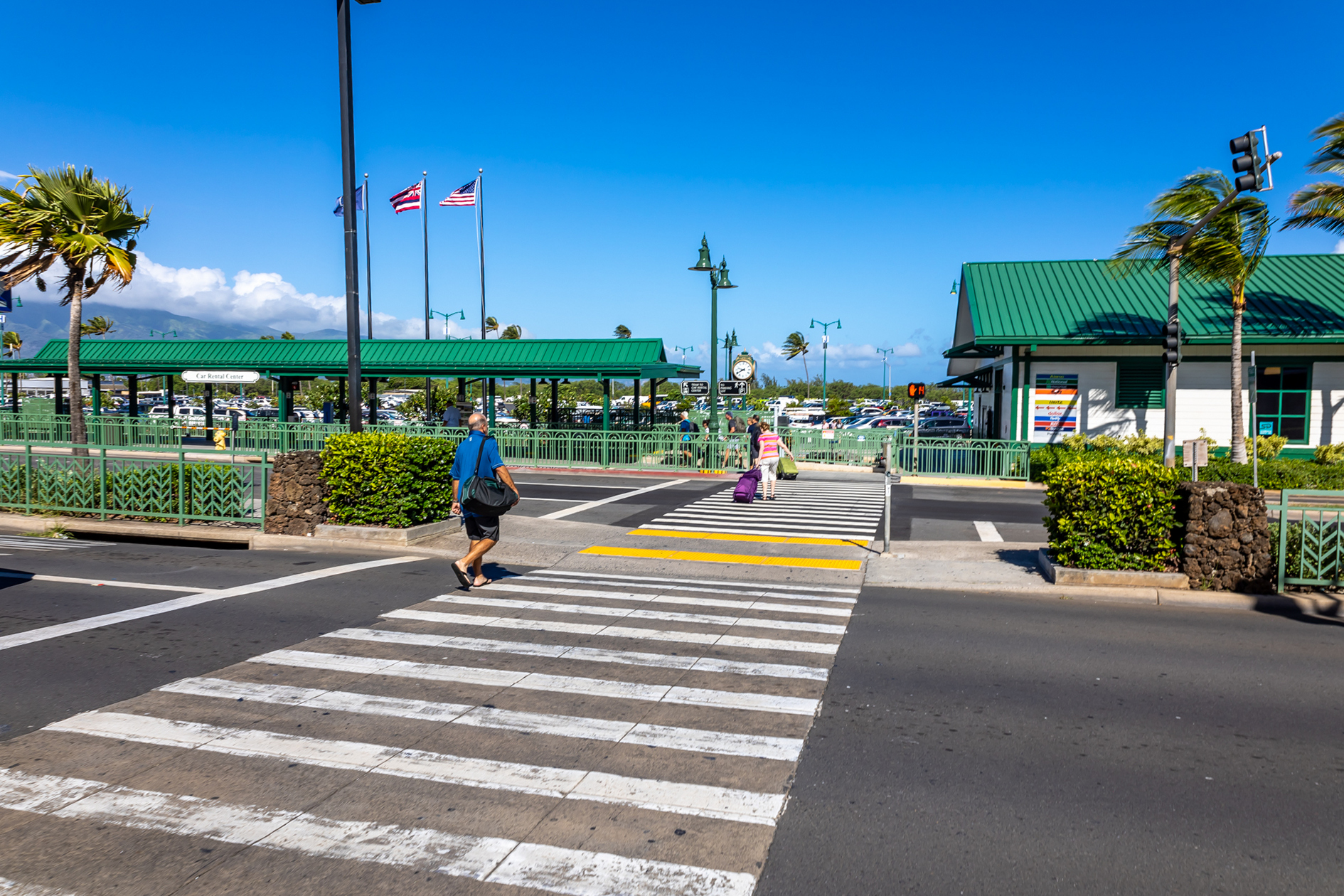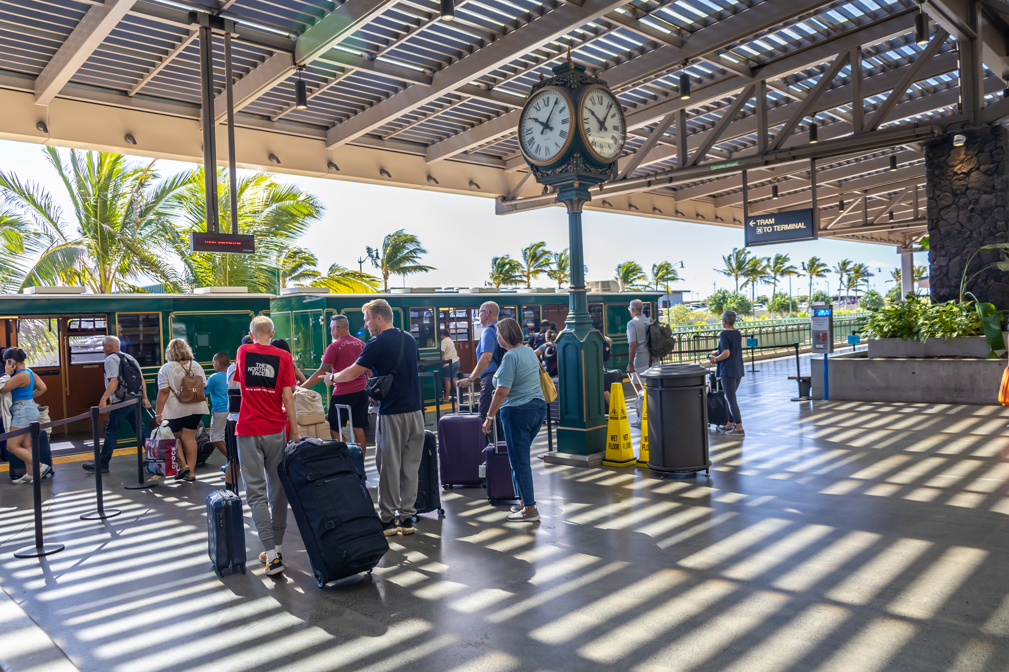 마우이 공항의 짐 찾는 곳에서 나오면, 건너편에 트램을 타는 정류장이 바로 보이기 때문에 혼동하는 것이 더 어렵다. 횡단보도를 타고 건너면 녹색지붕의 트램 정류장을 볼 수 있다. 비행기가 많이 도착하는 오전11시~오후3시 사이에는 트램정류장이 사람들로 가득차지만, 그 외 시간대에는 상대적으로 한산하다. 내 경우에는 오전 9시도착 풍경.