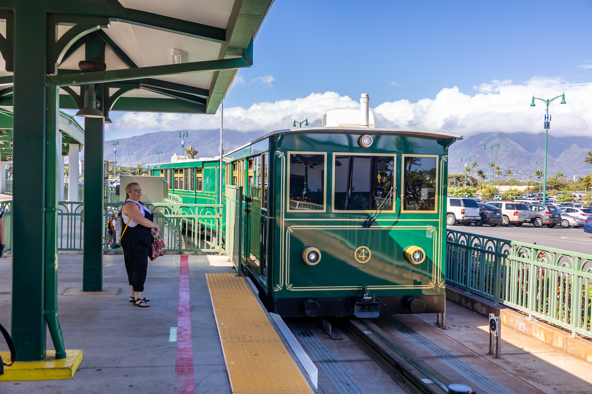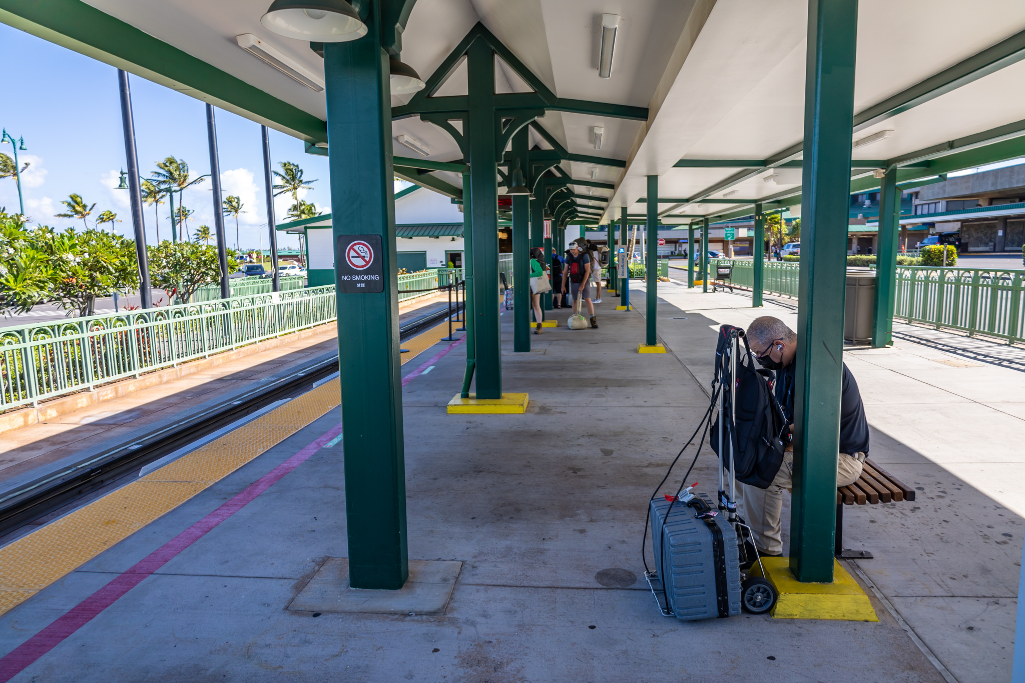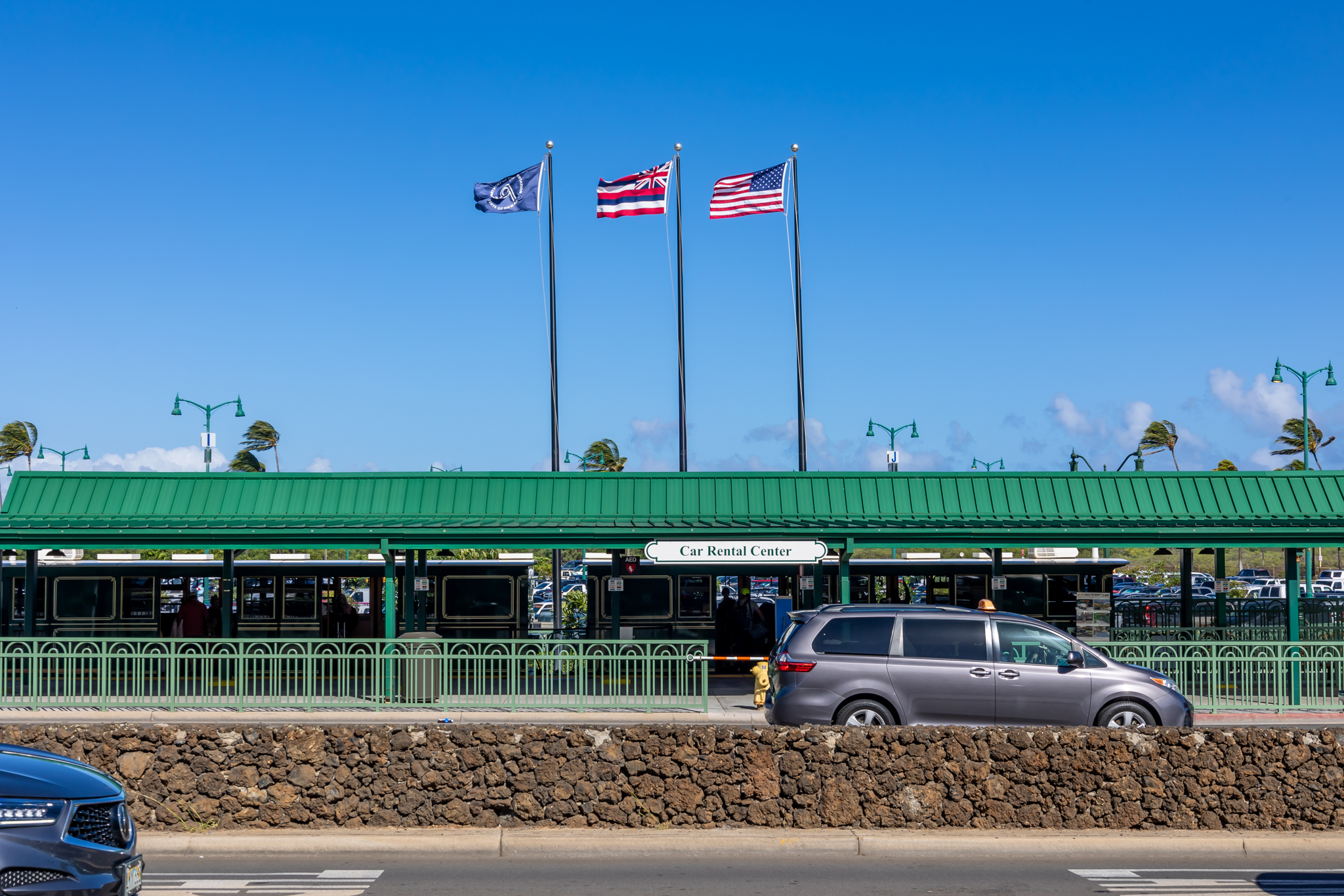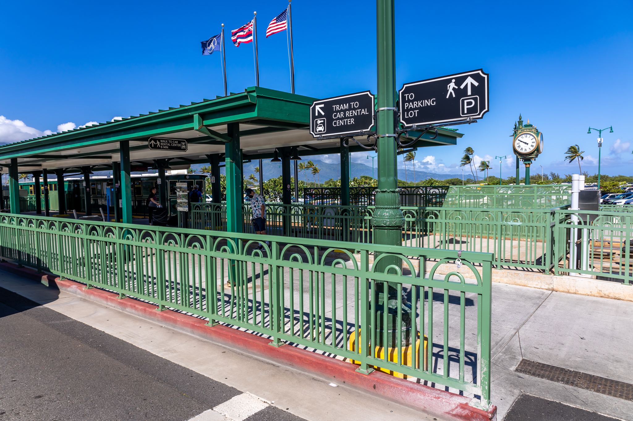 마우이 공항의 짐 찾는 곳에서 나오면, 건너편에 트램을 타는 정류장이 바로 보이기 때문에 혼동하는 것이 더 어렵다. 횡단보도를 타고 건너면 녹색지붕의 트램 정류장을 볼 수 있다. 비행기가 많이 도착하는 오전11시~오후3시 사이에는 트램정류장이 사람들로 가득차지만, 그 외 시간대에는 상대적으로 한산하다. 내 경우에는 오전 9시도착 풍경.