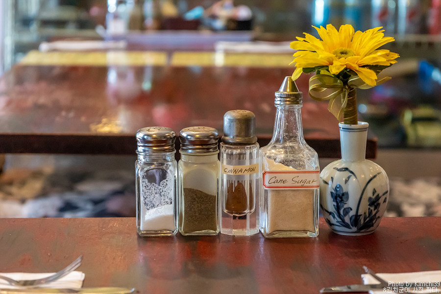 테이블에는 소금, 후추, 시나몬, 사탕 수수 설탕이 있었다.