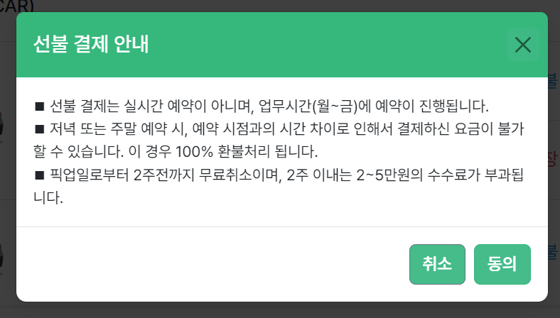 다만 선불결제의 경우 요금은 즉시 확인이 되지만, 실제 예약은 업무시간에 진행되기 때문에 주말에 들어온 예약의 경우 결제시 확인했던 요금과 실제 예약가능한 요금이 달라질 수 있다. 그렇지만, 정말 휴일이 몰려있는 상황만 아니라면, 대부분 예약했던 선불결제 요금과 큰 차이 없이 예약 가능하다.