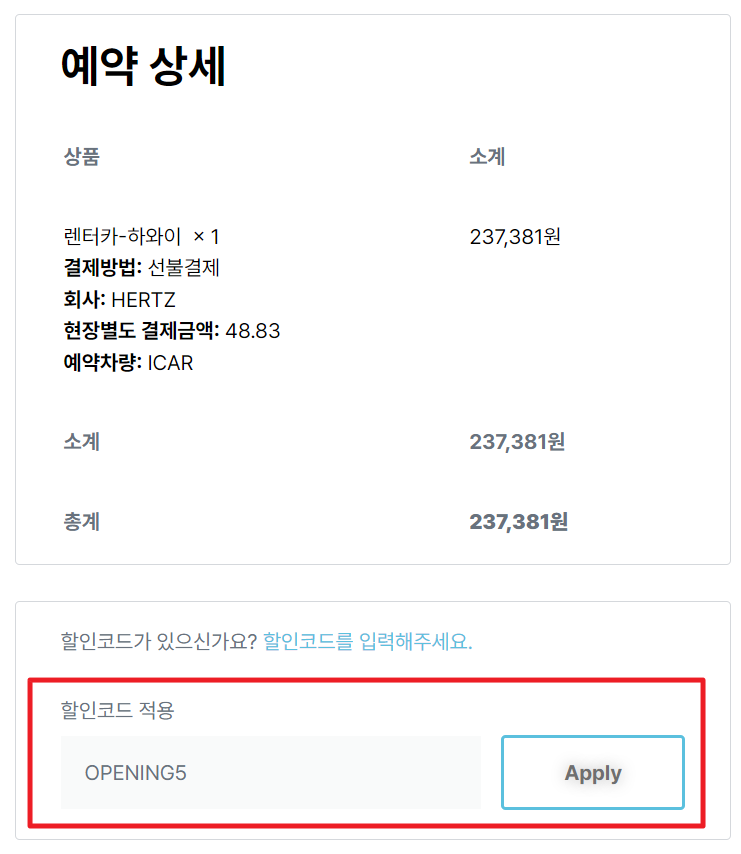 위와같이 5% 할인코드 OPENING5 를 입력하니, 237,381원의 5%인 11,869원이 할인된 것을 확인할 수 있다.