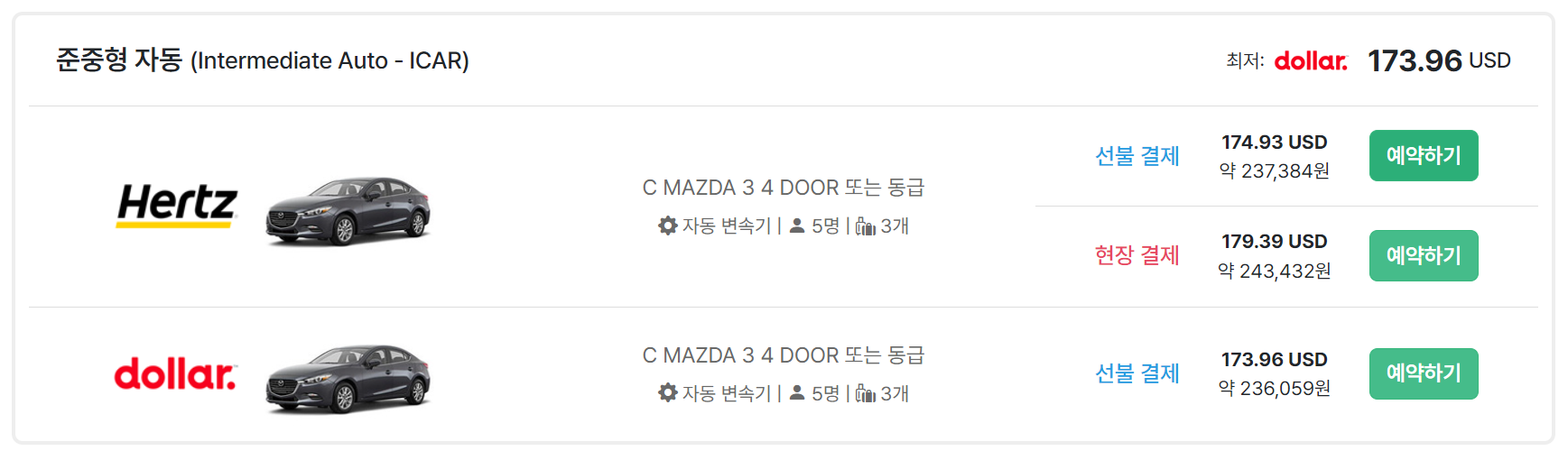 검색을 하면 위와같이 다양한 등급의 렌터카 차종과 가격을 확인할 수 있다. 지점 및 차종에 따라서 선불 또는 현장결제가 저렴한 경우가 나뉘며, 또한 허츠와 달러 렌트카의 요금도 그때그때 차이가 있어서 편리하게 비교할 수 있다. 또한, 기본적으로 가장 저렴한 차종으로부터 정렬되므로 그 외에 다양한 조건으로 차량 검색이 가능하다. 참고로 위에 나오는 선불결제 금액은 5% 할인코드가 적용되지 않은 금액이므로, 선불 결제 요금은 더 저렴하다고 보면 된다.