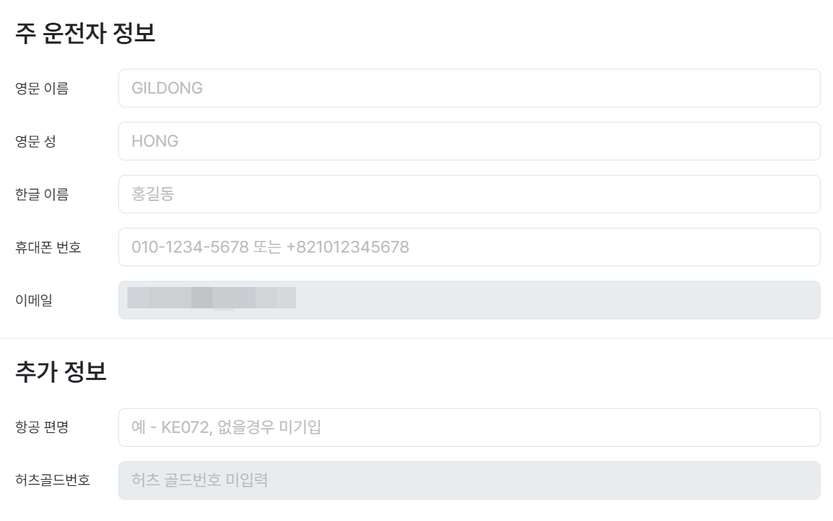 기본적으로 영문이름, 영문성, 한글이름, 휴대폰번호를 입력하게 되며, 이메일의 경우 회원가입할 때 이용한 이메일로 자동 발송된다. 또한, 항공 편명을 입력하면 항공기 지연 등의 상황이 발생했을 때 예약을 유지하게 되므로 입력하는 것을 권장한다. 또한, 허츠 골드번호는 이전페이지에서 입력 가능하다.