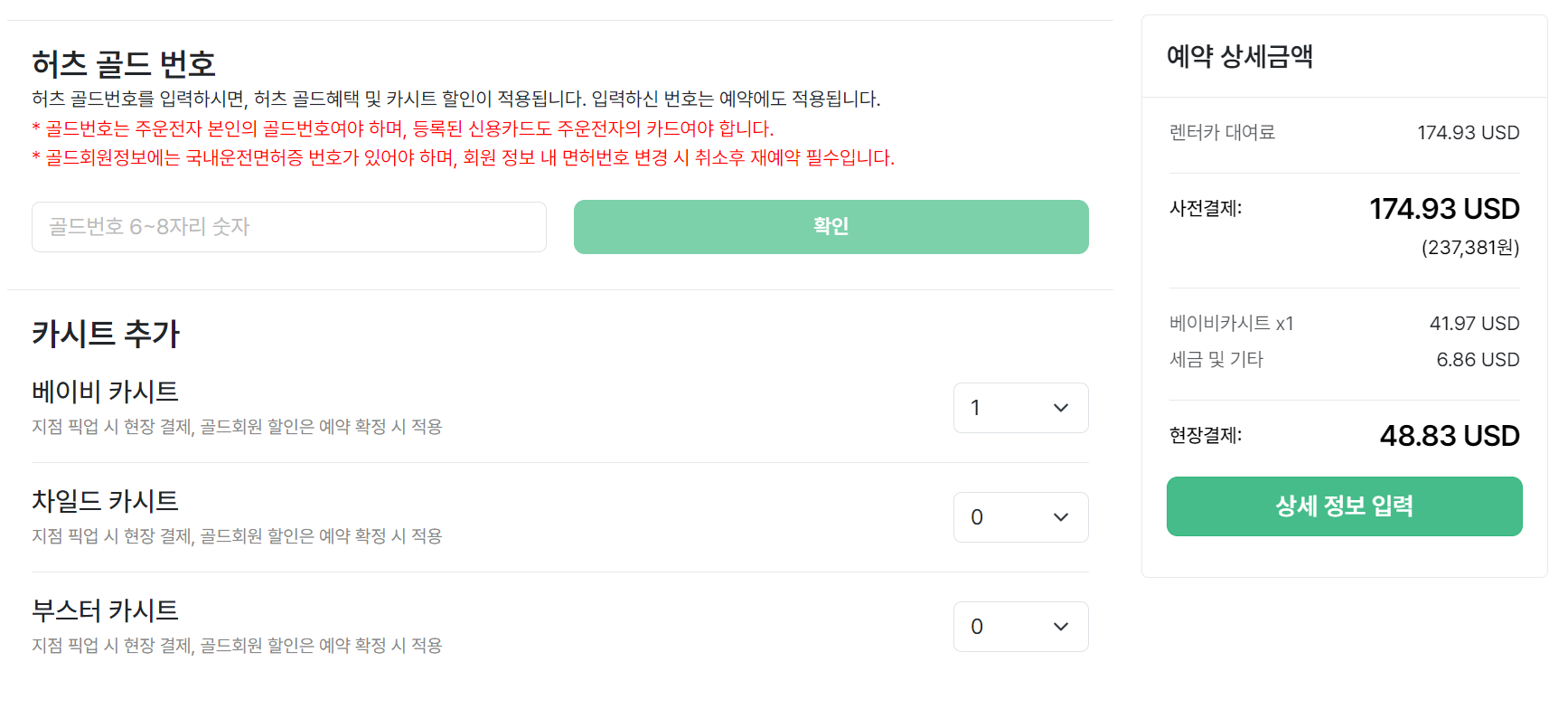 또한, 허츠 골드회원의 경우 골드번호를 입력하면, 골드카운터 이용(2번째 임차부터), 배우자 무료운전(현장결제 예약 한정), 그리고 카시트 할인 등의 혜택을 적용받을 수 있다. 카시트 비용은 골드번호를 입력하면 자동으로 할인된다.