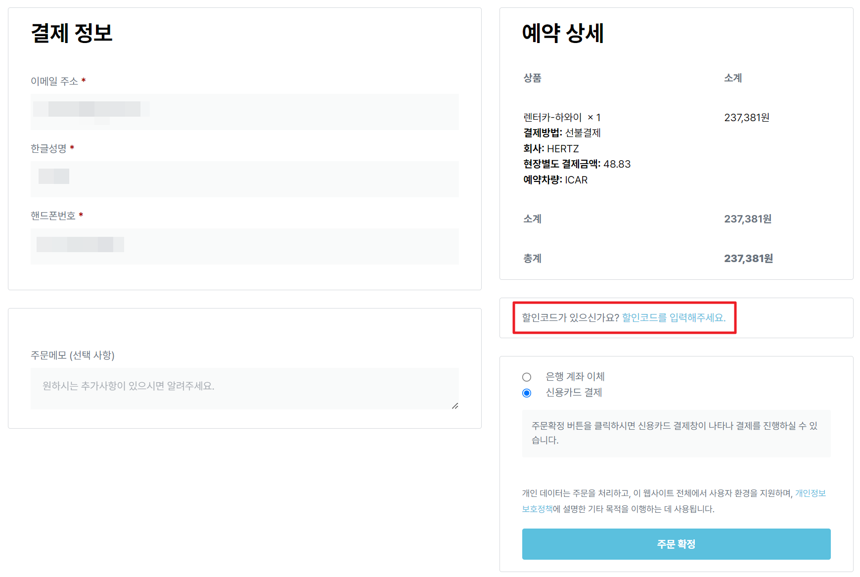 그다음 최종 화면에서 포함 사항 및 현장결제 사항을 확인한 후, 주 운전자 정보를 입력하면 된다.