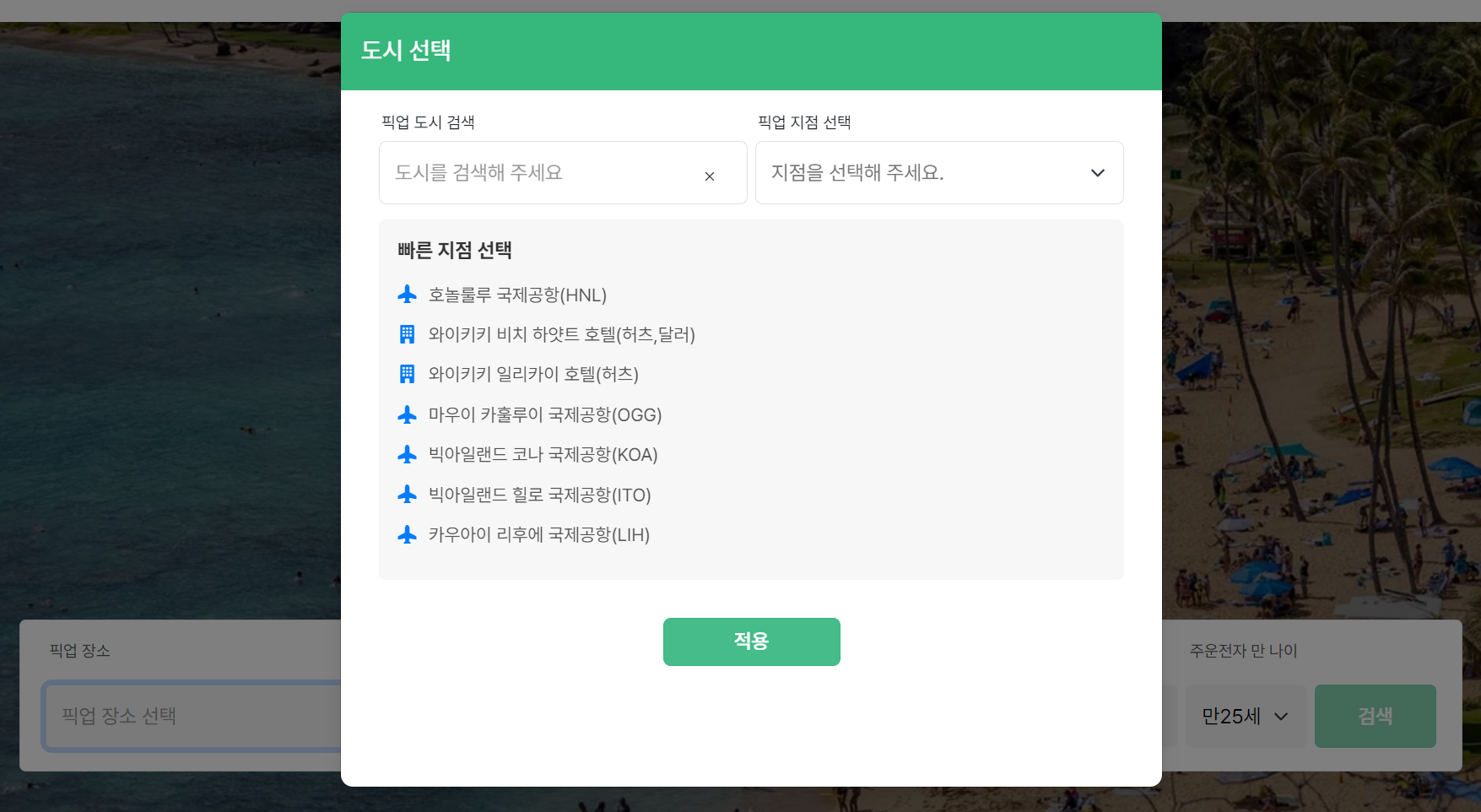 픽업장소는 도시와 지점을 직접 검색해도 되지만, '빠른 지점 선택'으로 편리하게 공항 또는 시내지점을 선택할 수 있다. 하와이는 워낙 지점의 숫자가 적다보니 빠른 지점선택에 있는 지점만으로도 거의 대부분의 지점 커버가 가능하다.
