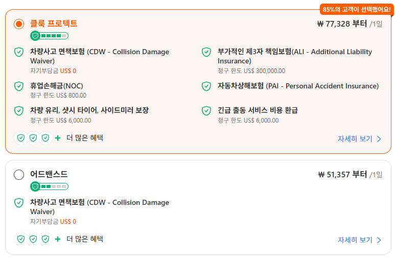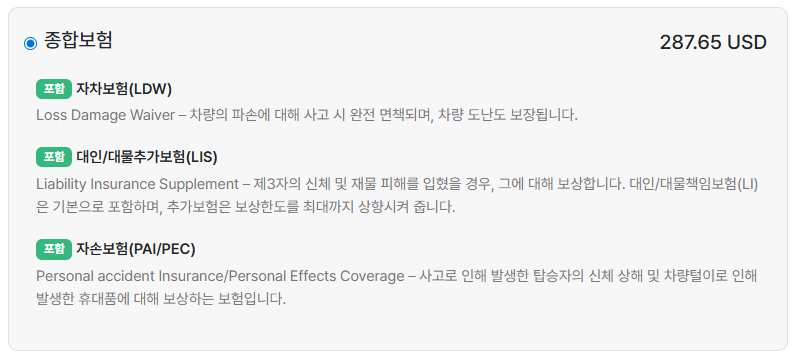렌터카를 예약할 때 보험의 포함여부는 상당히 중요한 만큼, 어떤 회사를 선택하던지 자차+대인대물 보험은 꼭 추가하는 것을 권장한다. 그 외에는 선택이지만.