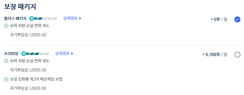 트립닷컴의 경우 대부분의 기본 요금인 플러스 패키지에는 '자차보험'만 포함되어있다.그러므로, 최소 프리미엄급 이상을 선택해야 대인/대물 보험인 '보장강화형 제3자 배상책임보험'이 추가된다. 따라서, 검색결과에서 꼭 클릭을 해 보고 보험의 포함여부를 확인해야 한다.