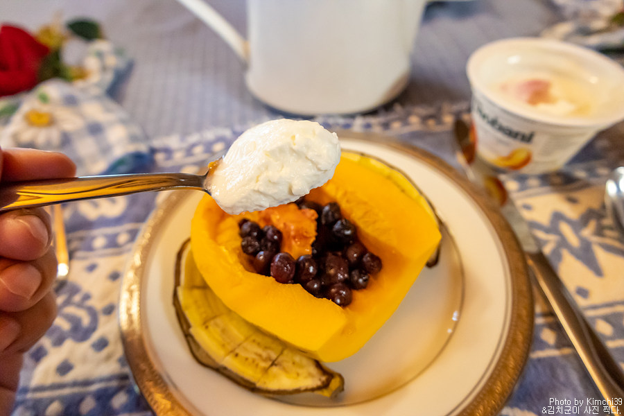 기본적으로 파파야 반쪽과 바나나가 세팅되어 있었다. 그 옆으로는 설탕에 절인 블루베리가 있어서 그것을 얹어서 블루베리와 함께 먹으라고 하셨다.