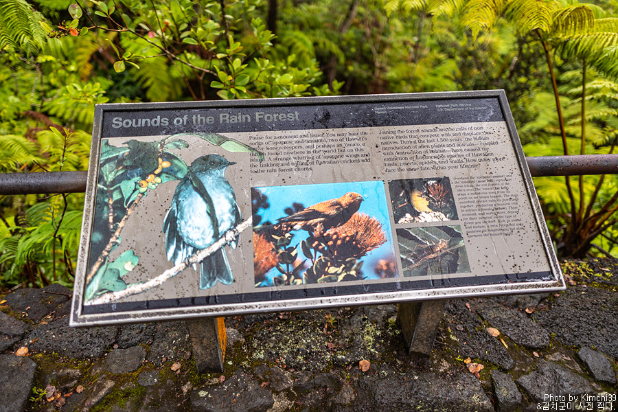서스톤 라바튜브의 트레일 시작지점에는 새소리를 들어보라는 안내판이 있는데, 실제로 다양한 새소리가 곳곳에서 들린다. 이날은 비가 왔기 때문일까, 아침의 개구리소리도 함께 섞여서 들렸다.