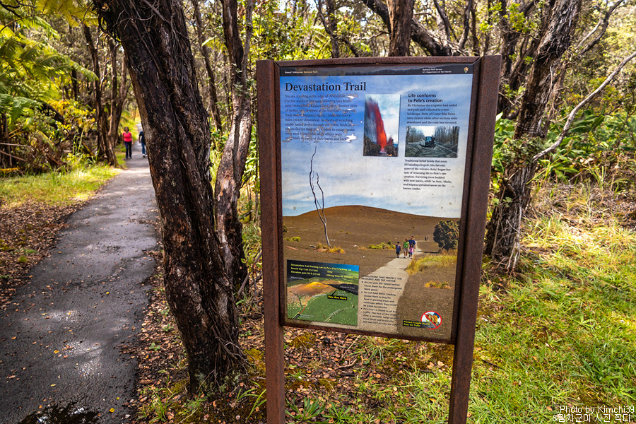 다시 크레이터림로드(Crater Rim Road)로 돌아온 후에는, 데버스테이션 트레일(Devastation Trail)을 걷기 위해서 이동했다. 트레일의 주차장에서는 킬라우에아 분화구를 내려다 볼 수 있는 포인트도 있는데, 그 트레일을 걷고 있는 사람들도 한 눈에 들어온다.
