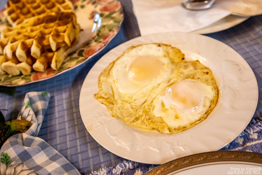 그리고 추가로 만들어주신 계란후라이 2개. 와플도 블루베리를 얹어서 먹었다. 처음에는 가볍게 먹고 화산 국립공원으로 출발할 생각이었는데, 생각보다 많이 먹고 출발하게 되었다. 뭐, 아침부터 든든하게 먹어서 나쁠 건 없으니까.