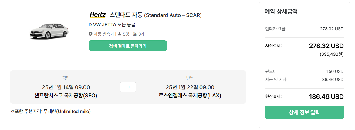 선불결제의 경우, 편도비, 카시트 등의 금액은 포함이 되지 않기 때문에 현장에서 결제를 해야 한다. 그렇기 때문에 샌프란시스코 -> 로스엔젤레스 편도의 경우에는 사전결제는 278.32 USD (약 395,493원)을 결제해야 하고, 나머지 편도비와 세금인 186.46 USD의 경우에는 현장에서 결제하게 된다.