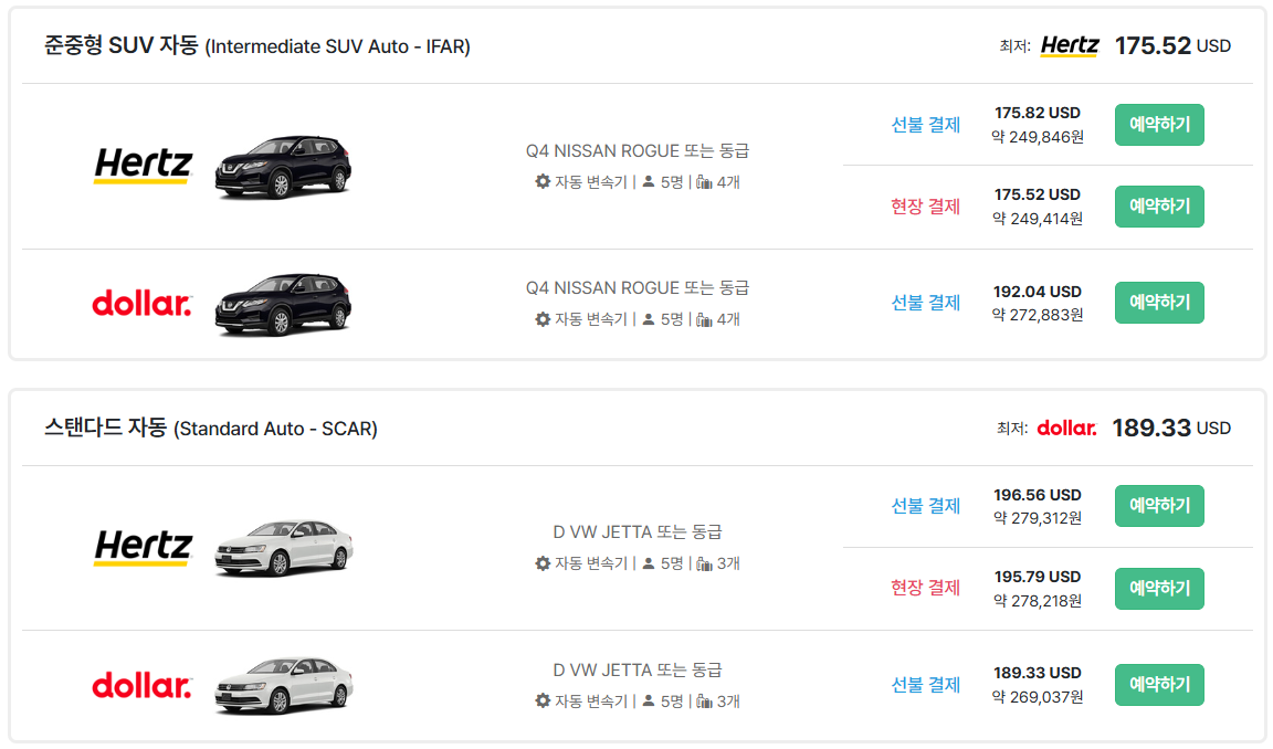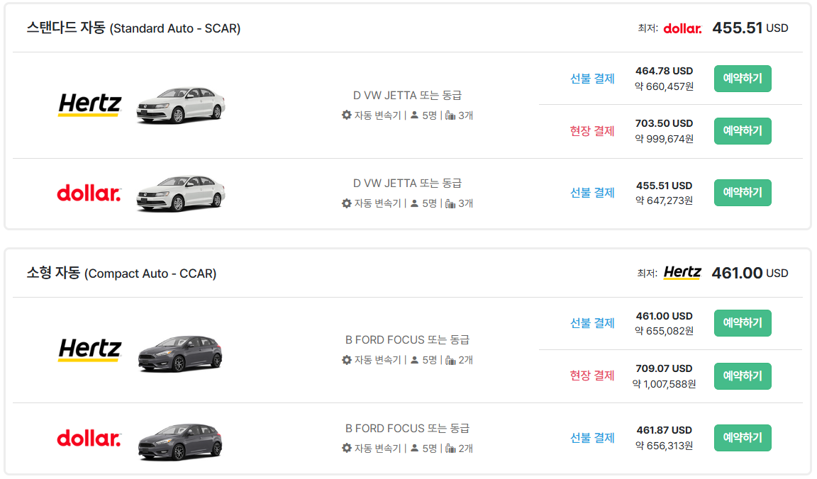 위의 예시를 보면, 선불결제의 경우 464.78 USD인데, 현장결제는 703.50 USD로 상당히 큰 차이가 난다. 그리고, 허츠의 선불요금보다 달러의 선불요금이 조금 더 저렴하다는 것을 알 수 있다.