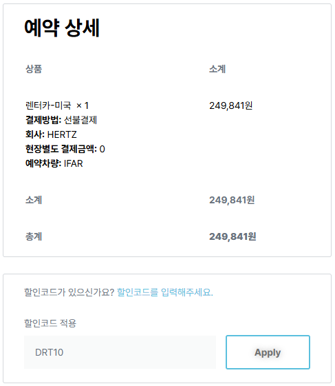 기본적으로 요금 정렬은 최저가 순으로 되는데, 조회한 기간에는 준중형SUV가 가장 저렴한 것으로 나온다. 선불결제는 약 249,846원, 그리고 현장결제는 약 249,414원으로 큰 차이가 없다. 그렇지만, 선불요금의 경우 20만원 이상일 때에는 1만원 할인코드의 적용이 가능하므로 최종적으로는 239,846원이 되어 할인되는 만큼 더 저렴해진다.