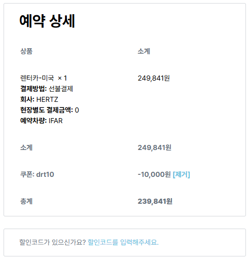 보이는 것처럼, 최종 결제 화면에서 20만원 이상 1만원 할인코드인 DRT10을 적용했을 때, 만원이 할인되어 239,841원이 결제금액이 되는 것을 확인할 수 있다.