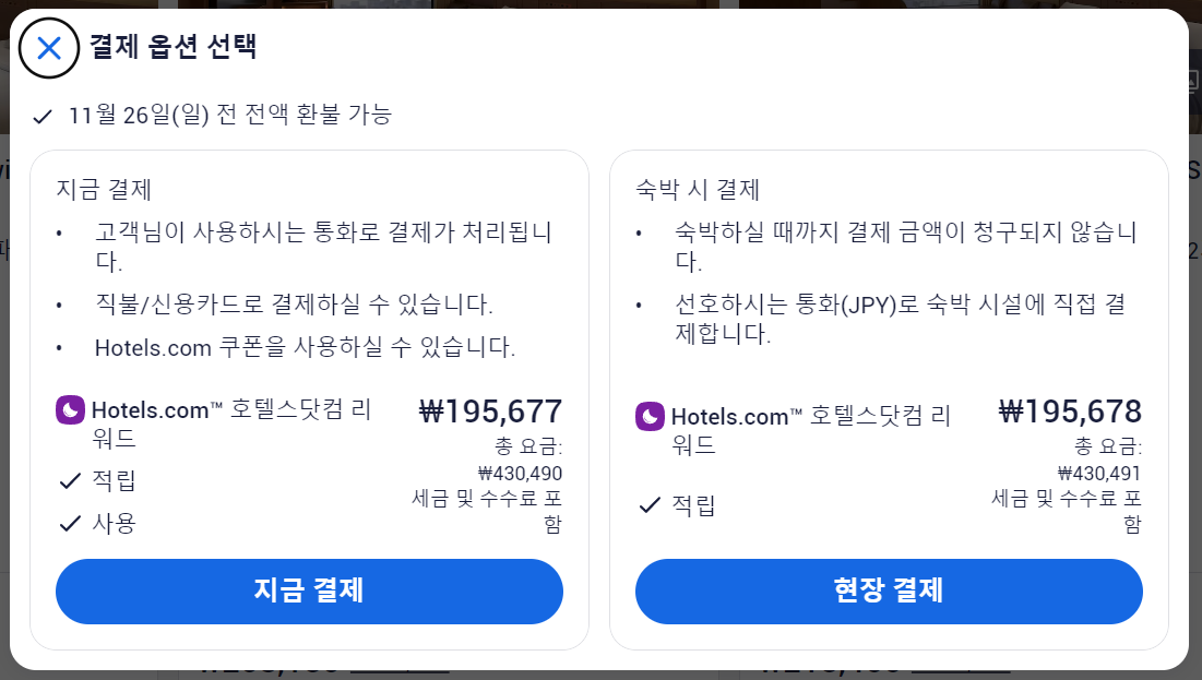 호텔스닷컴 할인코드의 경우에는 꼭 '지금결제'를 사용해야만 적용이 가능하다. 또한, 결제옵션 선택 내용 중 '호텔스닷컴 쿠폰을 사용하실 수 있습니다."라는 내용이 있기 때문에 이 호텔에 호텔스닷컴 쿠폰을 사용할 수 있는지의 여부도 확인할 수 있다.