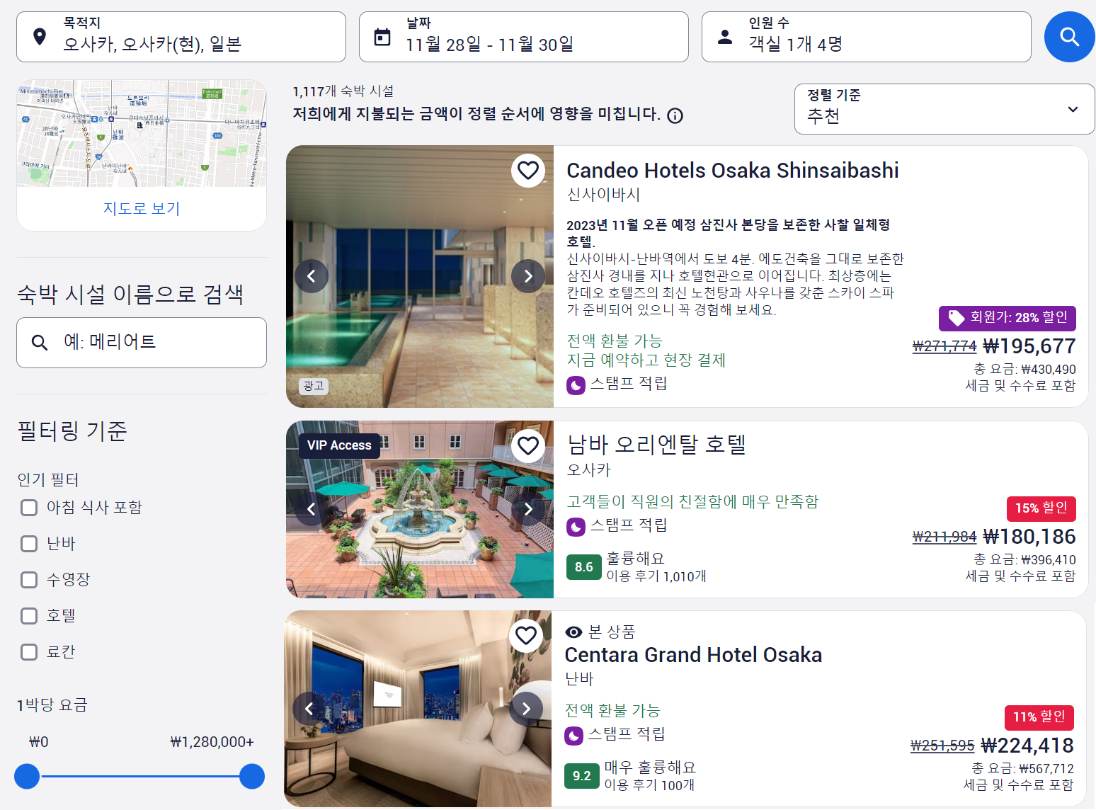 아직 정확하게 날짜가 확정된 것은 아니지만, 11월 28일-30일로 검색을 해 보았다. 검색은 오사카로 시작했는데, 원하는 곳들 위주로 조절해 나가면 된다.
