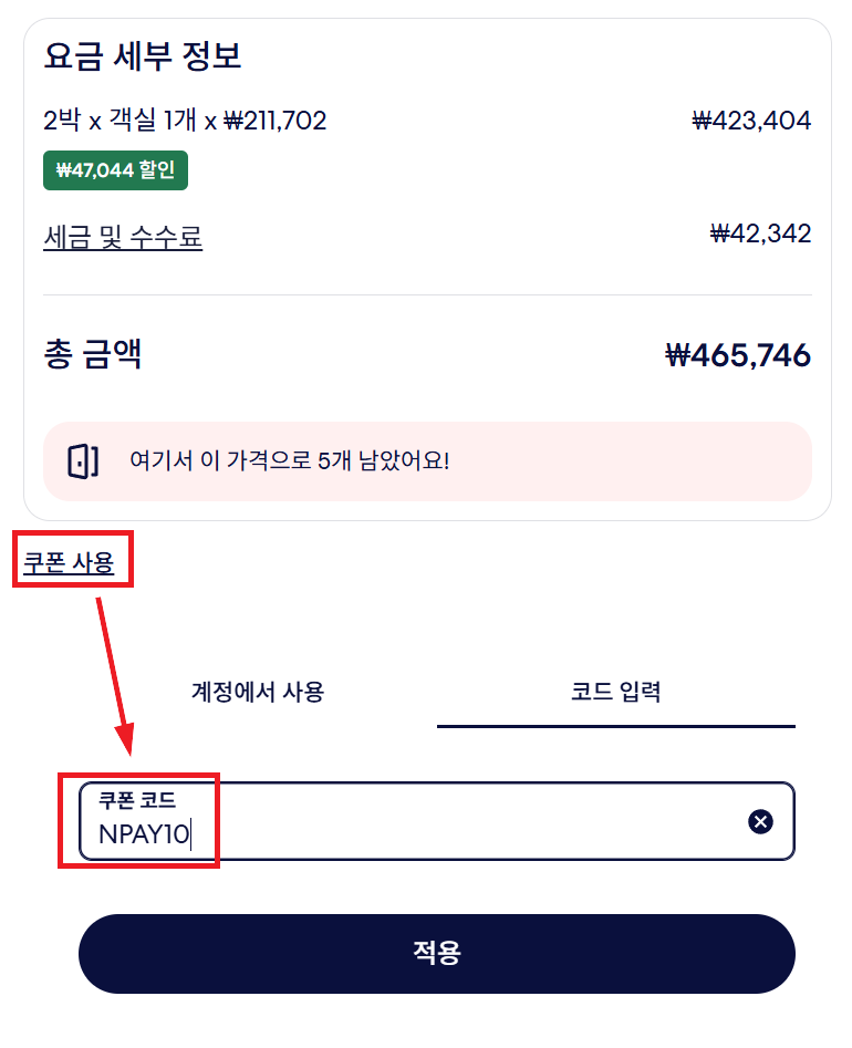 쿠폰은 요금 최 하단의 '쿠폰적용'을 클릭한 뒤 NPAY10 (10%) 또는 DT26 (8%)을 입력하면 된다. 만약 적합한 링크를 사용하라는 메세지가 나온다면, 위 전용링크를 클릭한뒤에 다시 진행하면 된다. 호텔 요금 중 세금 전 요금에서 10%인 42,340원을 할인받아서 최종적으로 423,406원이 되었다. 이정도면 상당한 할인율이라고 할 수 있다.