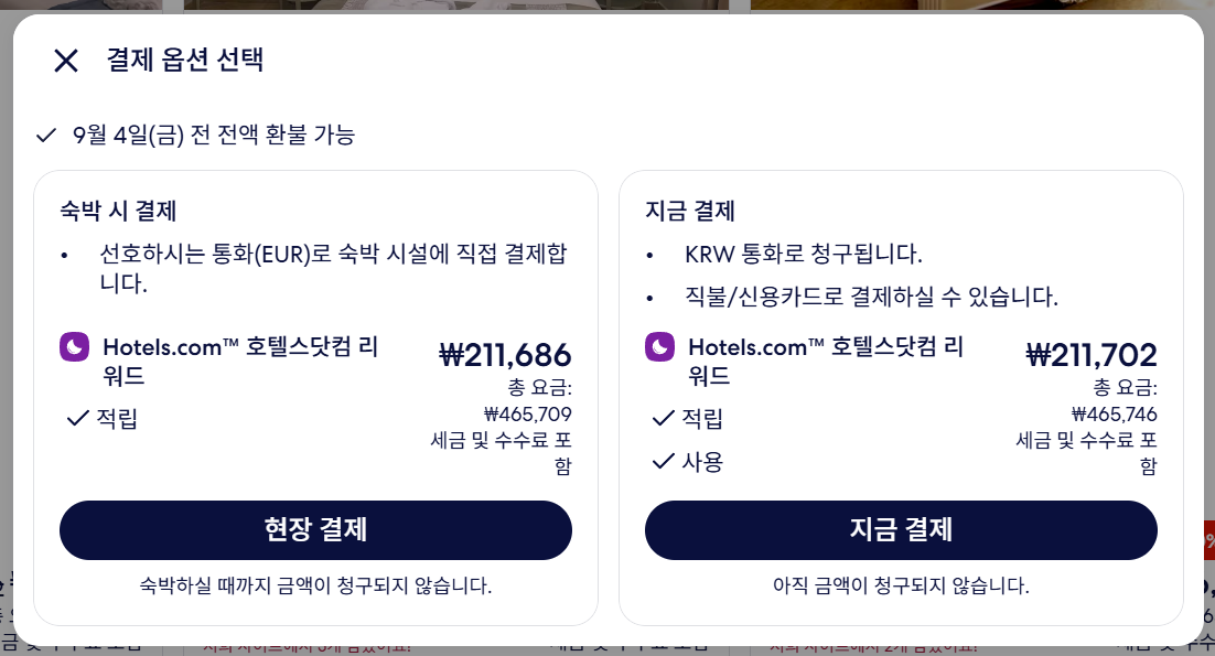 쿠폰 적용의 경우 지금 결제로 해야만 적용이 되므로, 지금결제를 선택하는 것이 좋다. 지금결제로 해야 표시된 한화로 결제를 할 수 있기 때문이다. 숙박시 결제로 하면 환율에 따라 이득을 볼수도 있고 손해를 볼 수도 있는데, 해외결제 수수료가 부과된다는 점도 꼭 감안해야 한다.