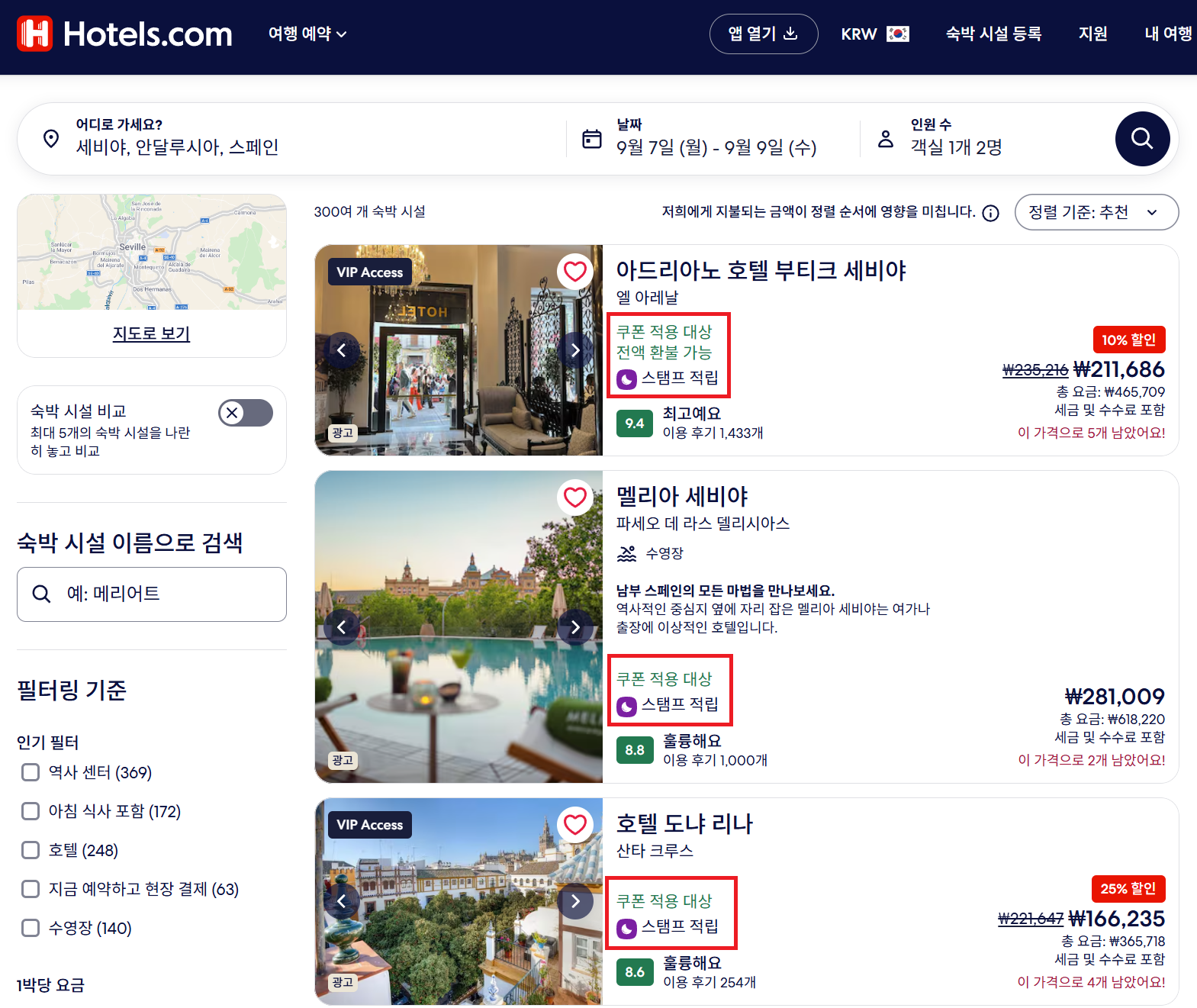 쿠폰이 적용 가능한 경우에는 '쿠폰 적용 대상'이라고 나온다. 편의시설에서 '주차'가 되는 숙소를 가장 우선으로 하였고, 그 다음 주방이 있는 숙소가 그 다음 선택이었다. 또한, 평점 9점 이상인 숙소를 위주로 검색하되, 마땅한 곳이 없으면 8점 이상의 숙소로 선택했다. 도시에 따라서는 세비야처럼 도심에 있는 숙소에서 묵기도 하고, 아니면 외곽의 더 저렴하고 주방이 있는 숙소에 묵기도 하면서 조금씩 조절했다.
