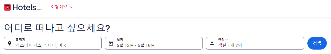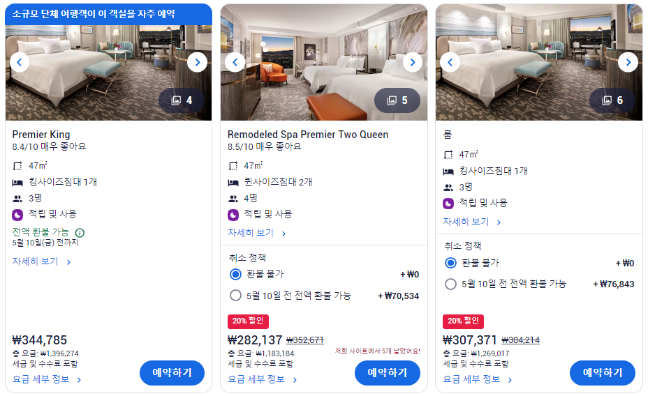 이번에는 라스베가스 호텔을 검색해 보았다. 라스베가스는 벌써 10번 넘게 다녀온 곳이라 매번 흥미롭지 않을거라고 생각하면서 가지만, 새로운 것들이 워낙 많이 생겨나다보니 갈 때마다 볼거리가 있는 곳이기도 하다. 위 날짜는 실제 가는 날짜와는 조금 다르지만, 그래도 비슷한 날짜로 조회를 해 보았다.