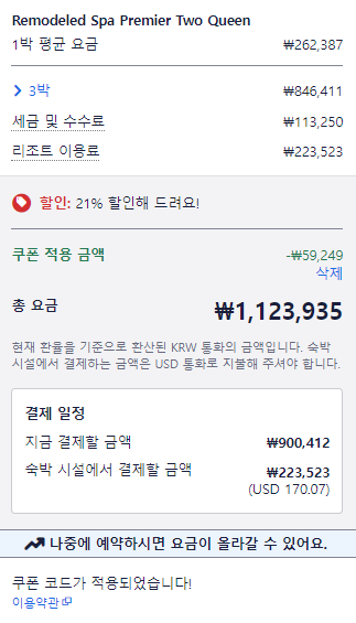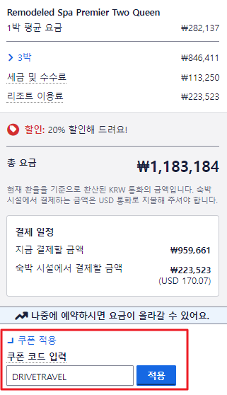 호텔스닷컴 3월 할인코드는 위 이미지처럼, 마지막 결제 화면에서 입력할 수 있다. DRIVETRAVEL 이라는 할인코드를 적용하면 된다. 세금 및 수수료, 리조트 이용료에는 할인이 적용되지 않아서, 846,411의 7%인 59,249원이 할인되었다. 특히, 리조트피는 사전에 지불하는 것이 아니라 현장에서 지불하는 것이라서 어쩔 수 없는 부분이기도 하다.