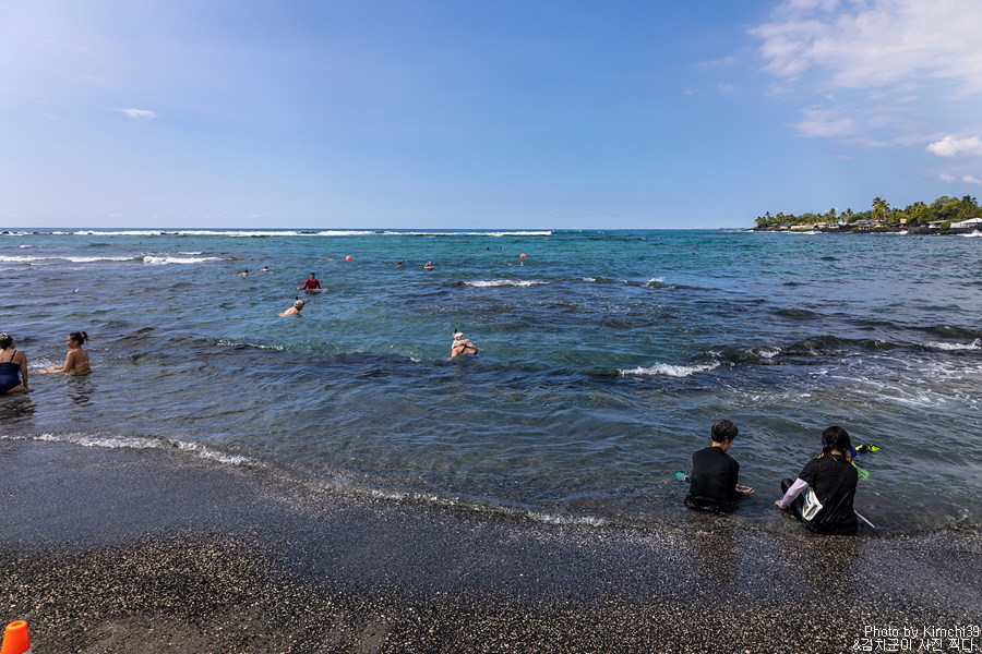 카할루우 비치파크에는 라이프가드가 있어서 안전하게 물놀이를 즐길 수 있다. 이날은 다소 파도가 있는 날이었는데, 해변에서 조금 떨어진 곳은 파도가 심하지 않아서 스노클링을 하는데에는 문제가 없어보였다. 빅아일랜드의 경우 다른 섬들과 다르게 가장 젊은 곳이다보니 모래사장이 있는 해변이 드물다. 카할루우 비치파크의 경우에는 굵은 검은색 모래가 있기는 하지만, 그래도 어느정도 해변이 있고 조금 멀리까지 나가도 그렇게 깊지 않아서 스노클링을 하기에 좋다. 이날은 스노클링 장비가 없어서 스노클링을 하지는 못했지만, 이후에 스노클링 장비를 사서 스노클링을 할 수 있었다.