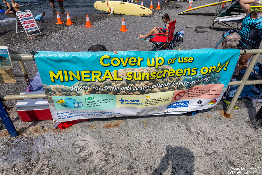 가능하면 산호에 손상이 가지 않는 선크림(선블록)을 사용하자는 안내. 산호에게 무해한 선스크림은 그냥 수퍼마켓이나 ABC마트 같은 곳에서 쉽게 살 수 있다.